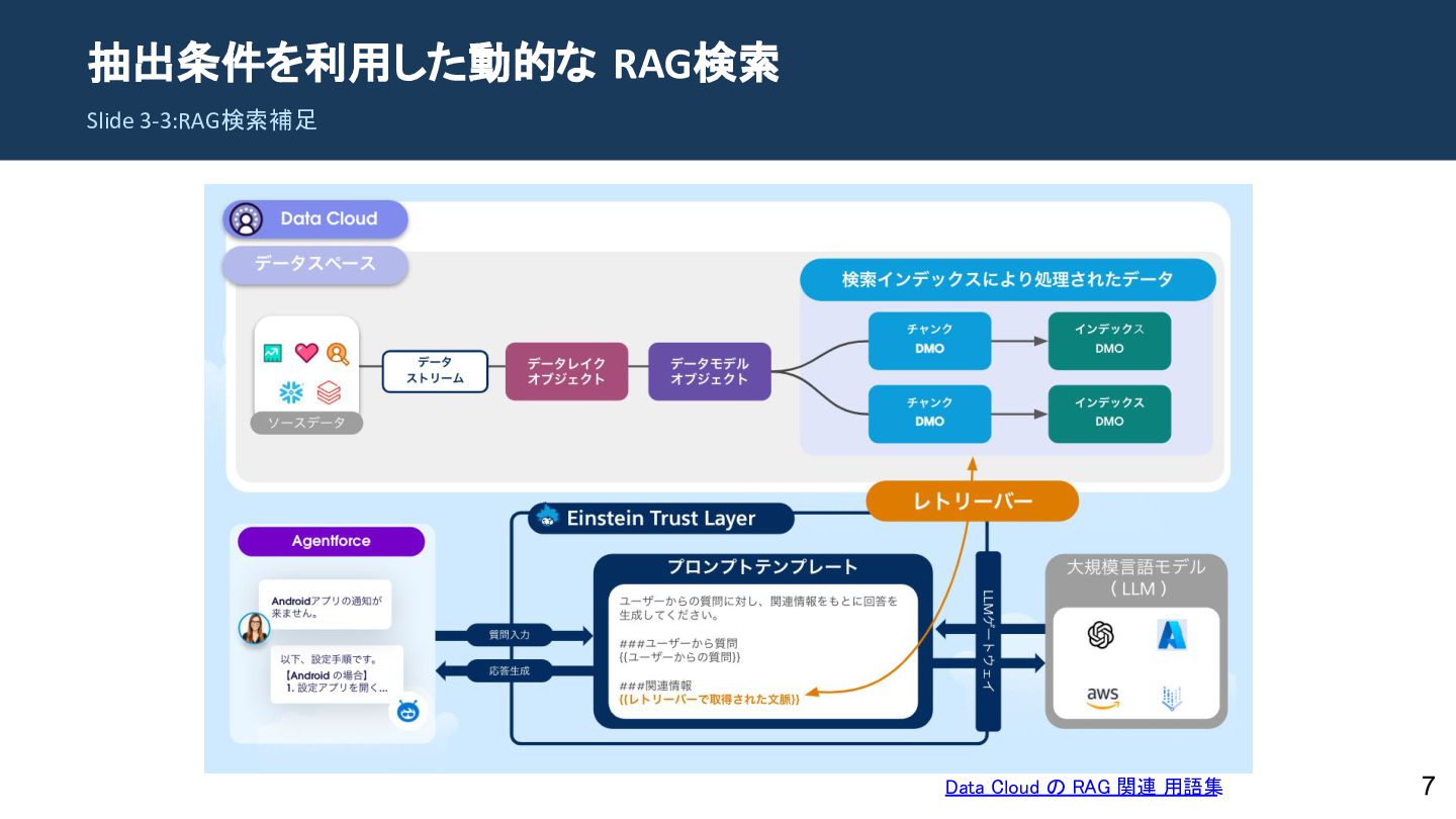 抽出条件を利用した動的な RAG検索 Slide 3-3:RAG検索補足 Data Cloud の RAG 関連 用語集