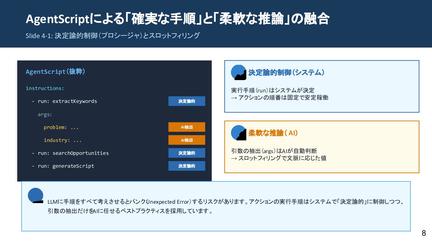AgentScriptによる「確実な手順」と「柔軟な推論」の融合 Slide 4-1: 決定論的制御(プロシージャ)とスロットフィリング AgentScript(抜粋) instructions: - run: extractKeywords 決定論的