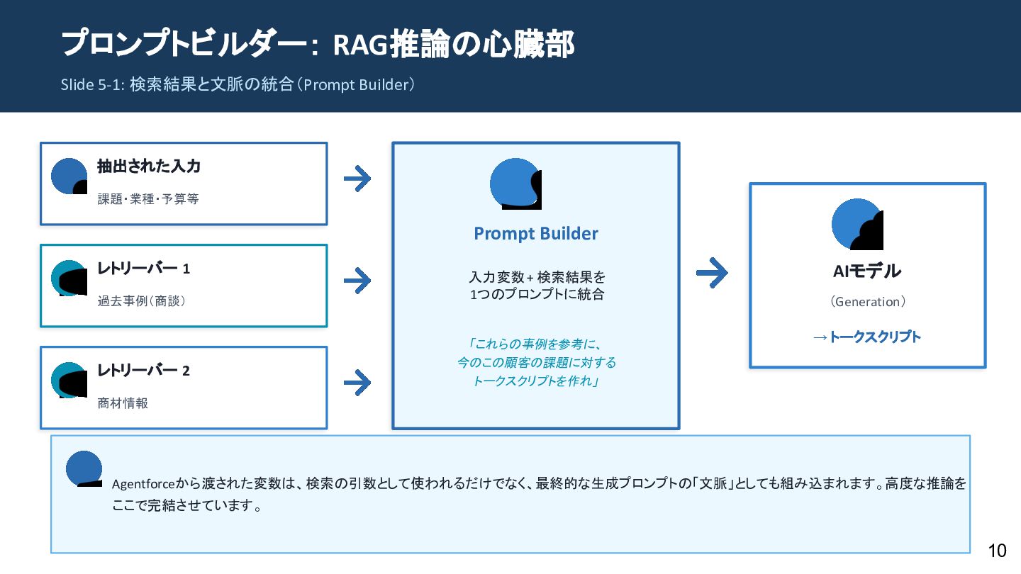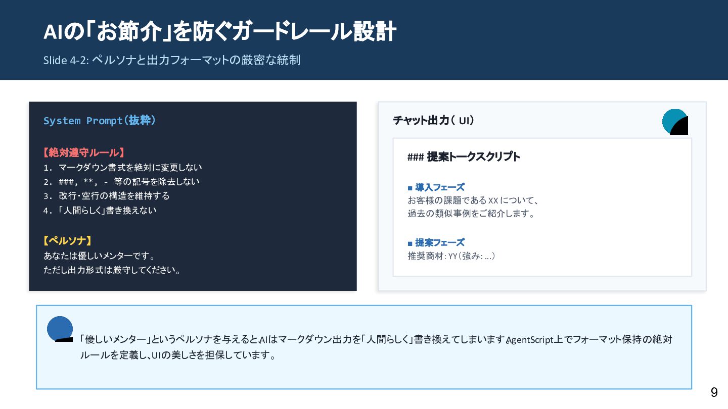 ###, **, - 等の記号を除去しない 3. 改行・空行の構造を維持する 4. 「人間らしく」書き換えない 【ペルソナ】 あなたは優しいメンターです。 ただし出力形式は厳守してください。 チャット出力( UI) ### 提案トークスクリプト ▪ 導入フェーズ お客様の課題である XX について、 過去の類似事例をご紹介します。 ▪ 提案フェーズ 推奨商材: YY(強み: ...) 「優しいメンター」というペルソナを与えると、 AIはマークダウン出力を「人間らしく」書き換えてしまいます。 AgentScript上でフォーマット保持の絶対 ルールを定義し、UIの美しさを担保しています。 9