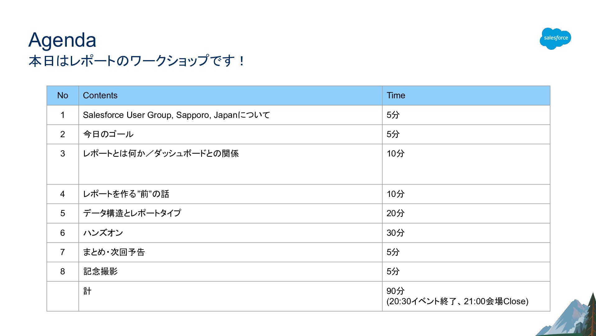 Agenda 本日はレポートのワークショップです! No Contents Time 1 Salesforce User Group, Sapporo,