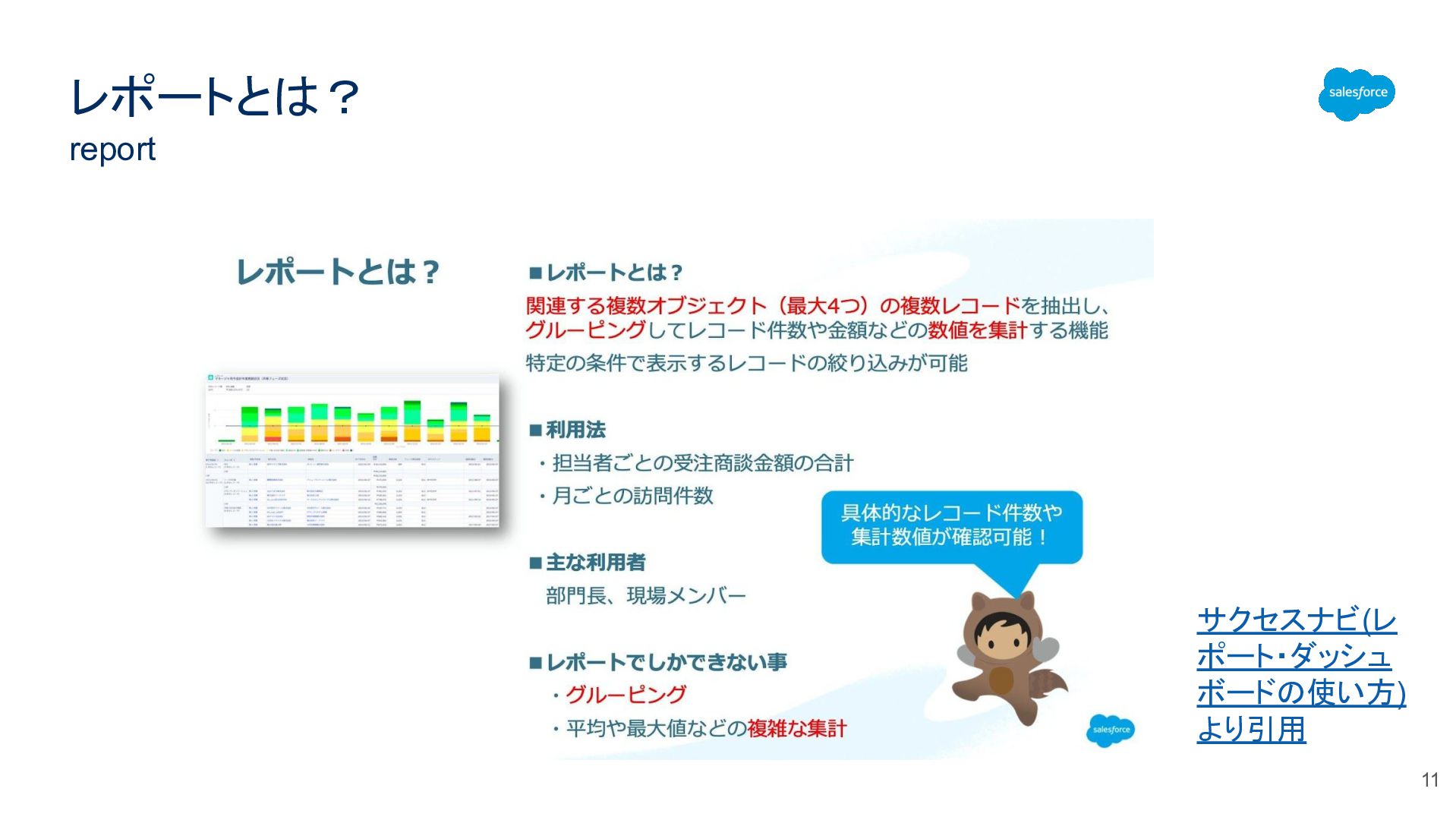 レポートとは? report サクセスナビ(レ ポート・ダッシュ ボードの使い方) より引用 11