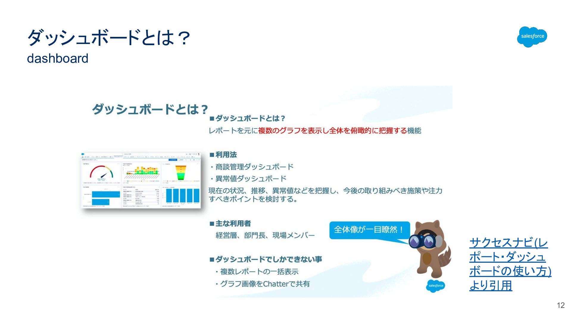 ダッシュボードとは? dashboard サクセスナビ(レ ポート・ダッシュ ボードの使い方) より引用 12