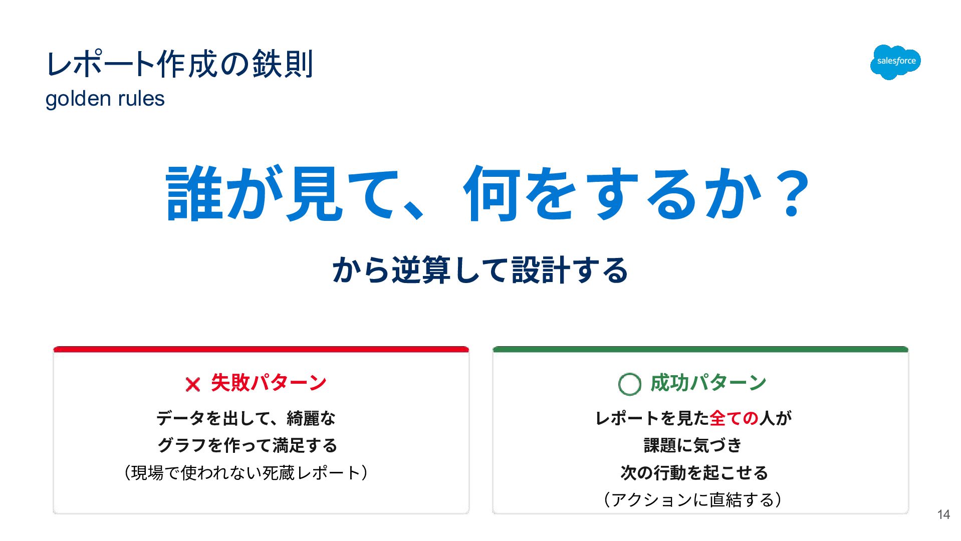 レポート作成の鉄則 golden rules 誰が⾒て、何をするか? から逆算して設計する 失敗パターン データを出して、綺麗な グラフを作って満⾜する (現場で使われない死蔵レポート) 成功パターン