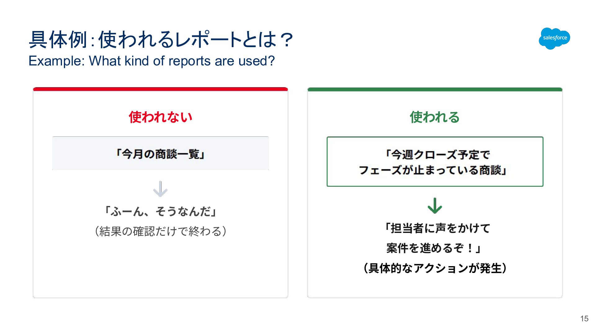 具体例:使われるレポートとは? Example: What kind of reports are used? 使われない 「ふーん、そうなんだ」