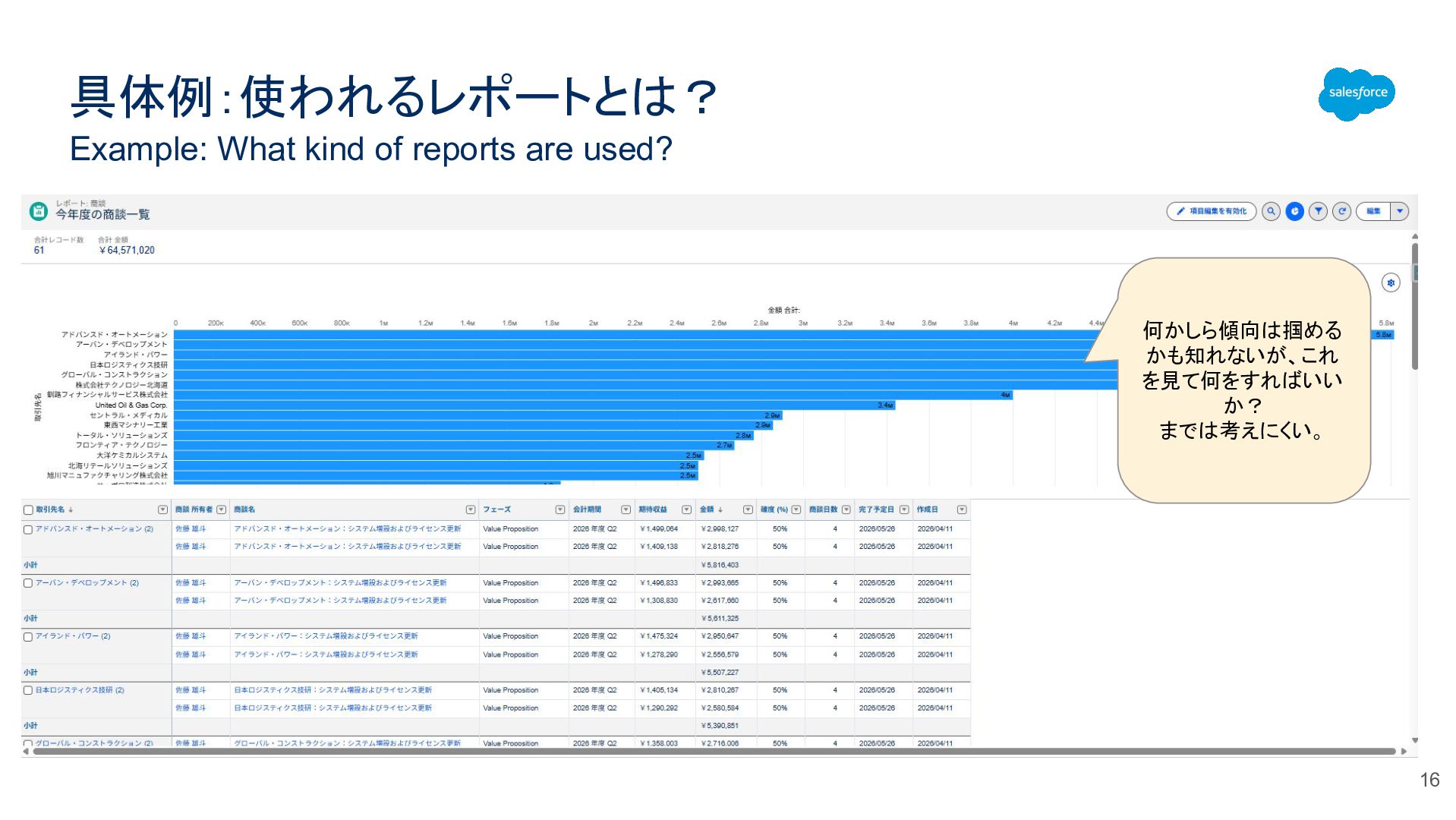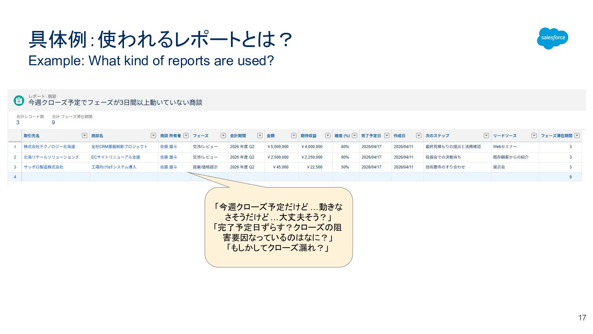 具体例:使われるレポートとは? Example: What kind of reports are used? 17 「今週クローズ予定だけど