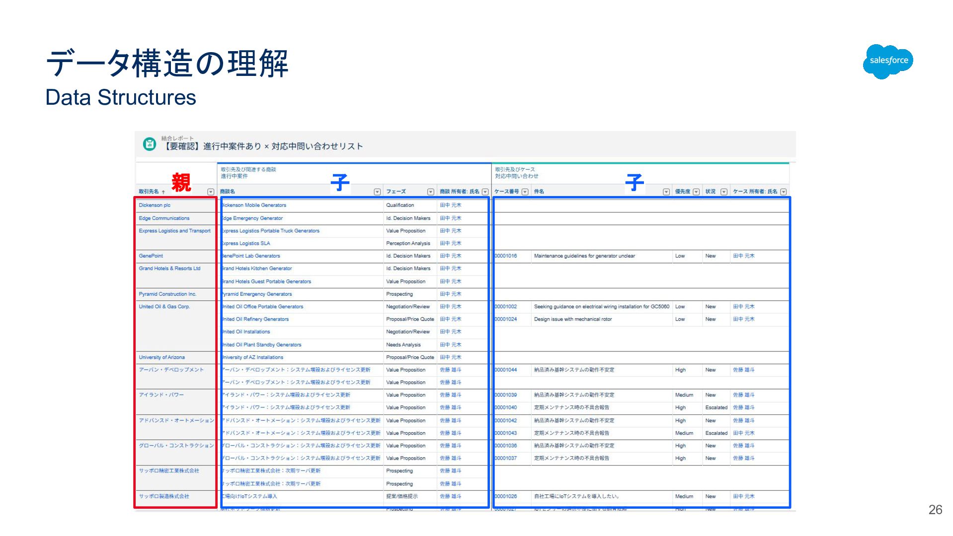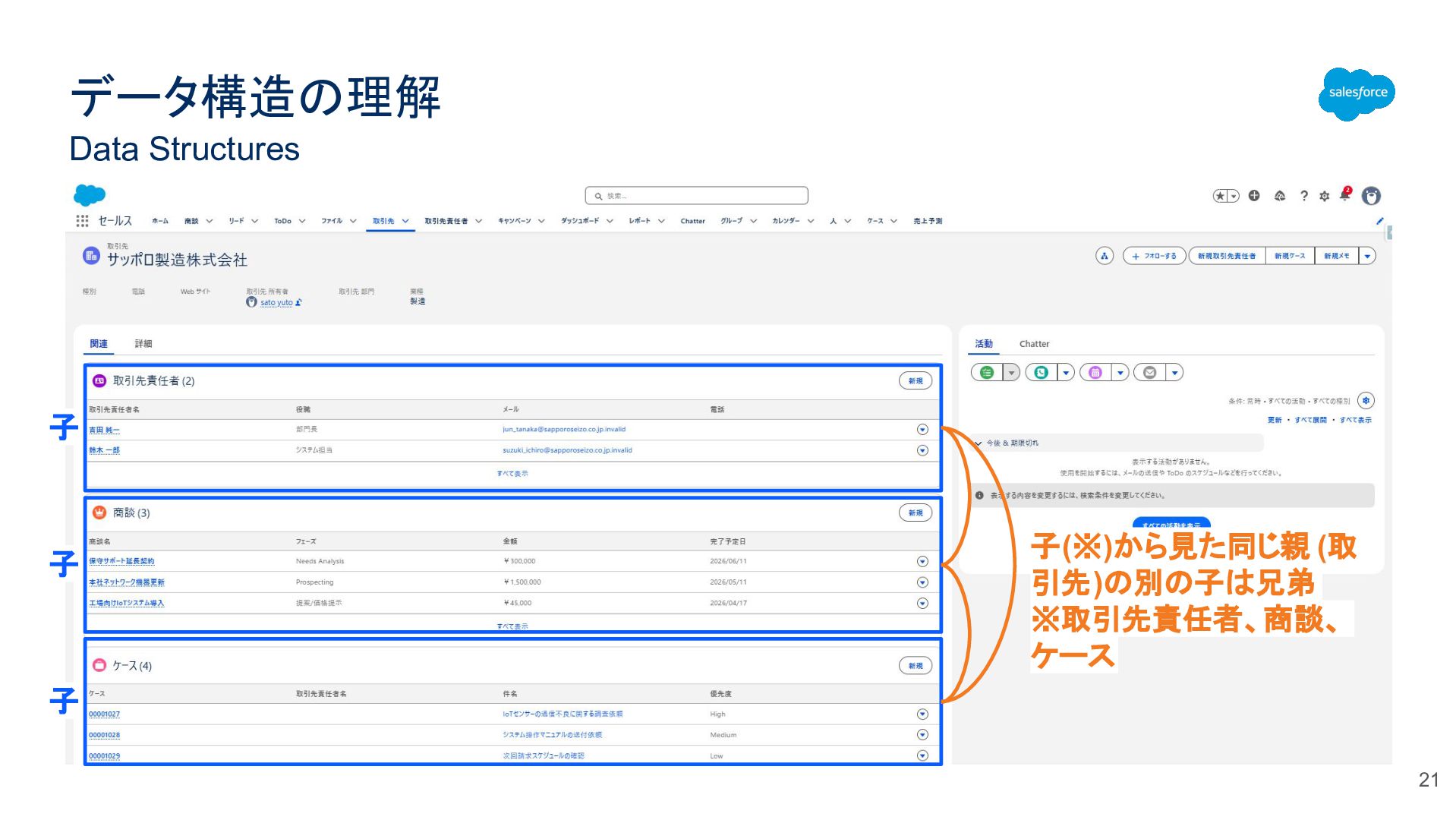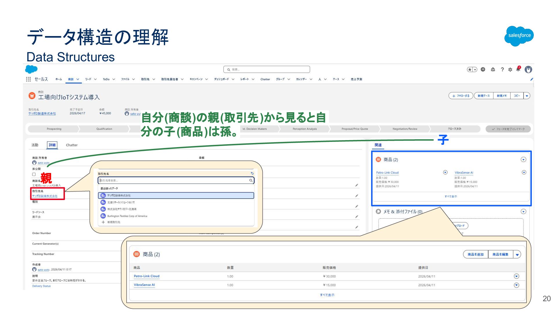データ構造の理解 Data Structures 20 親 子 自分(商談)の親(取引先)から見ると自 分の子(商品)は孫。