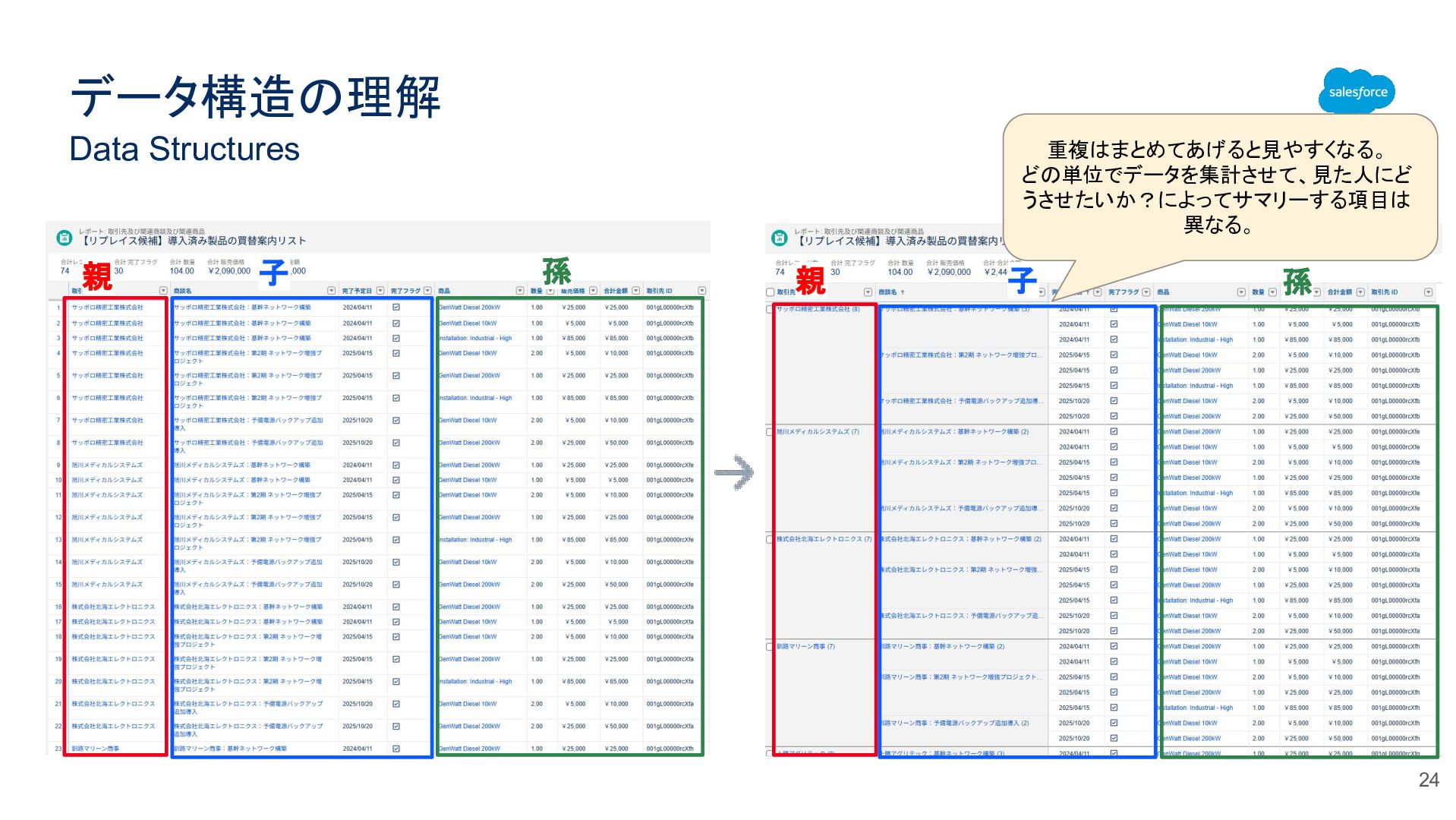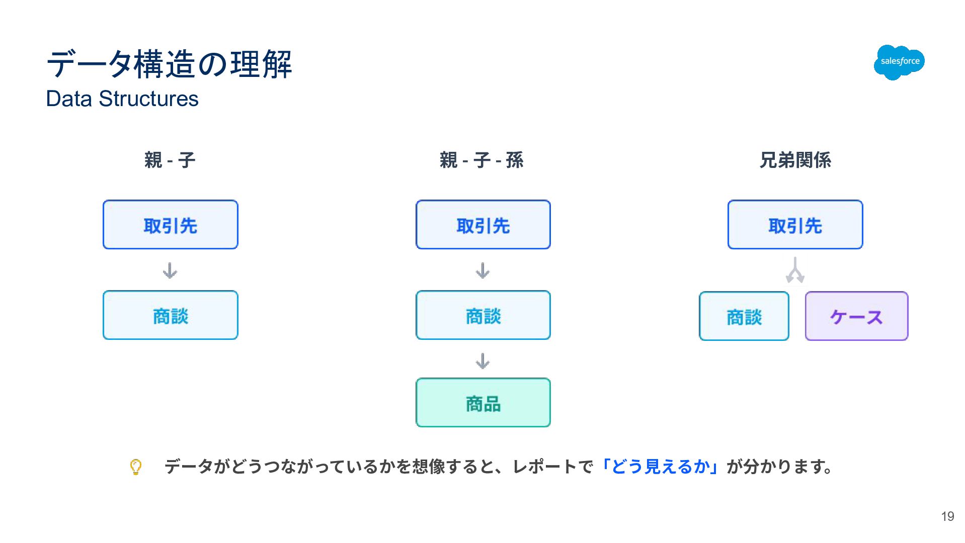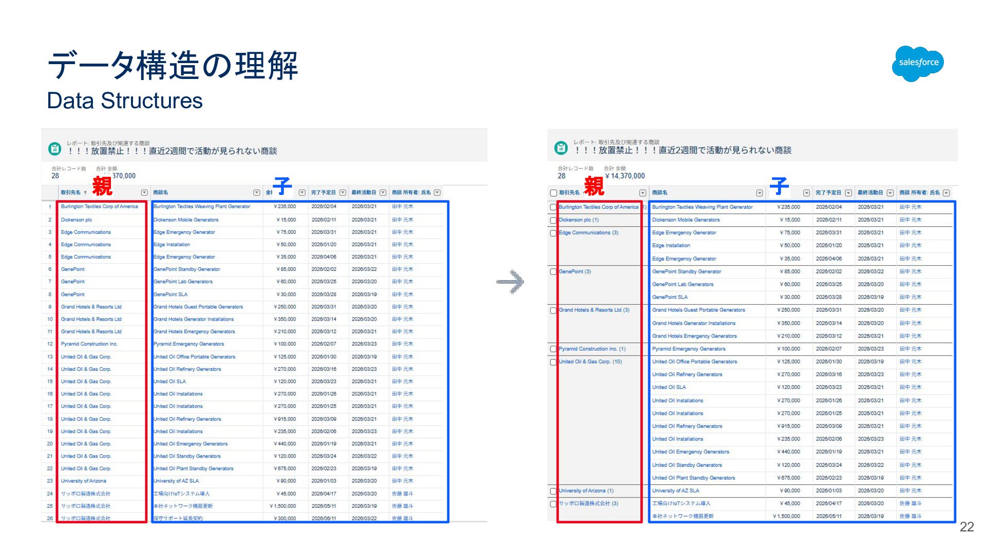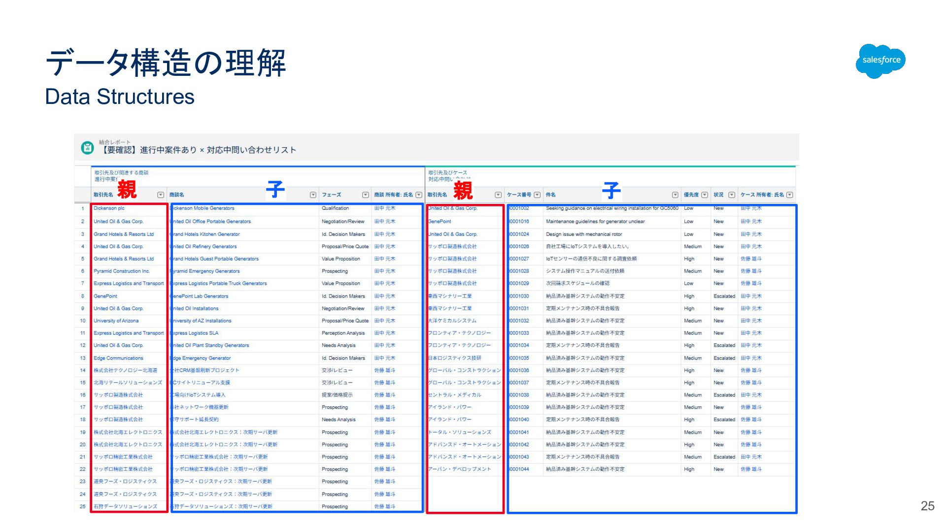 データ構造の理解 Data Structures 20 親 子 自分(商談)の親(取引先)から見ると自 分の子(商品)は孫。