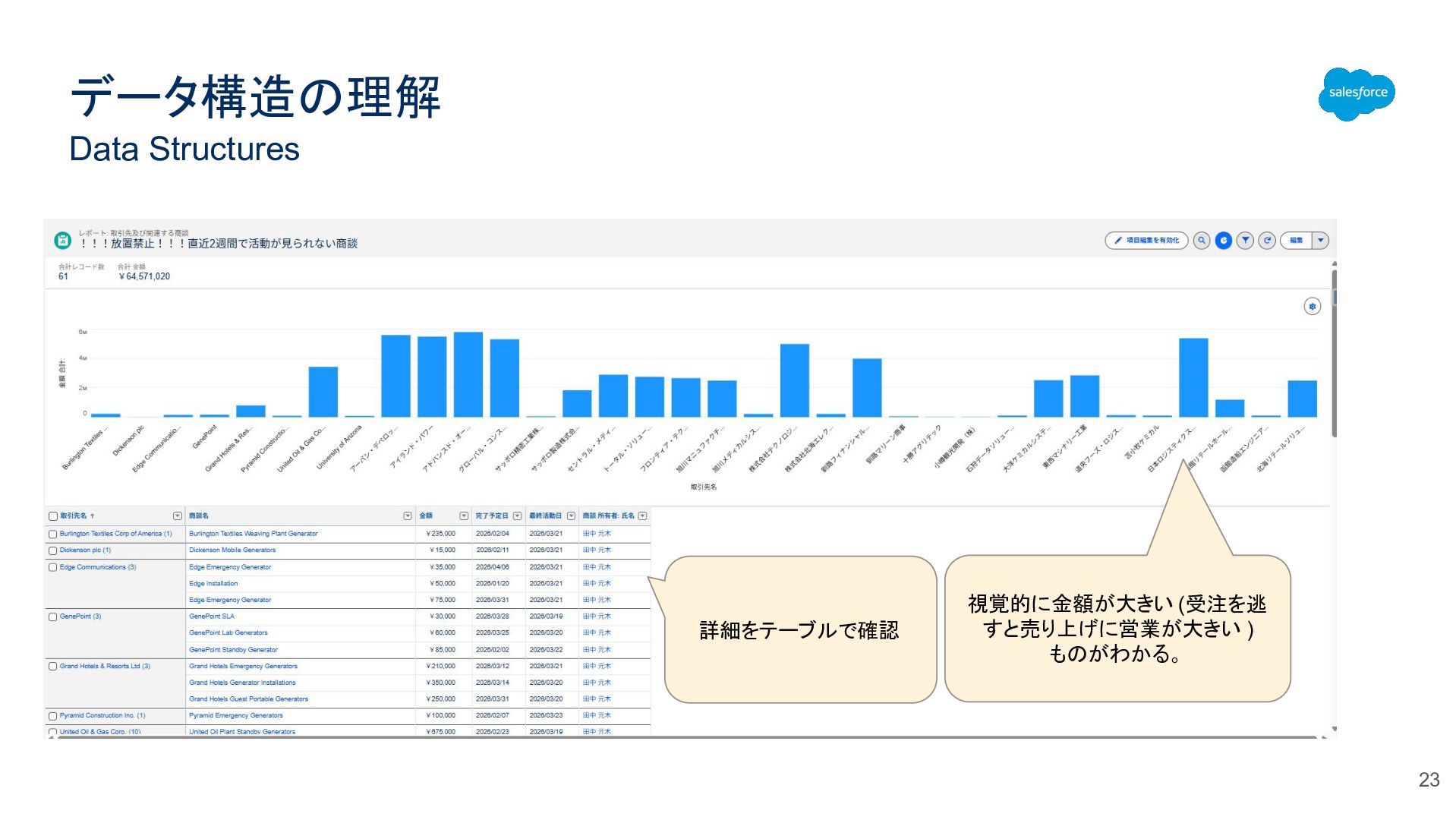 データ構造の理解 Data Structures 23 視覚的に金額が大きい (受注を逃 すと売り上げに営業が大きい ) ものがわかる。 詳細をテーブルで確認