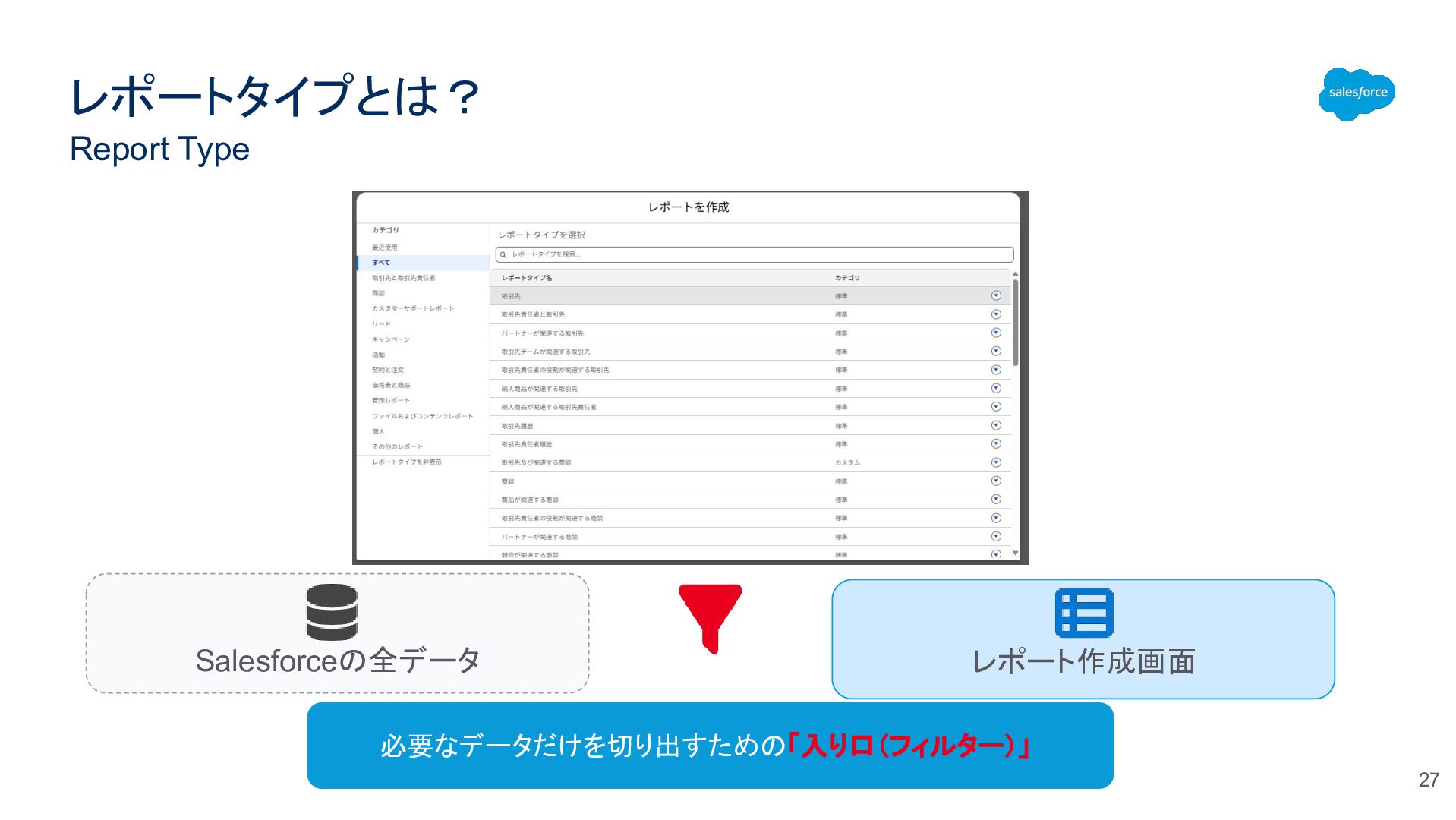 レポートタイプとは? Report Type 27 必要なデータだけを切り出すための「入り口(フィルター)」 Salesforceの全データ レポート作成画面