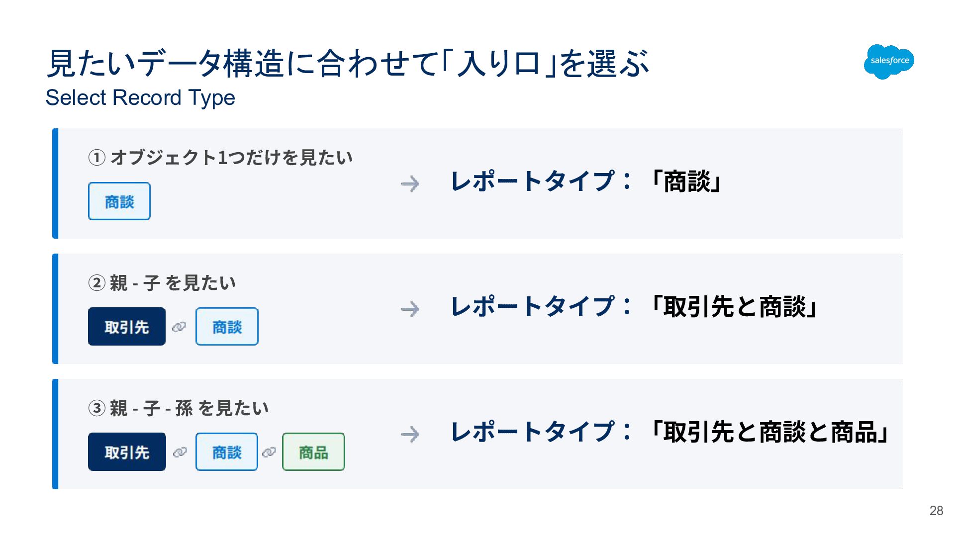 見たいデータ構造に合わせて「入り口」を選ぶ Select Record Type 28 レポートタイプ:「商談」 レポートタイプ:「取引先と商談」 レポートタイプ:「取引先と商談と商品」 ① オブジェクト1つだけを⾒たい