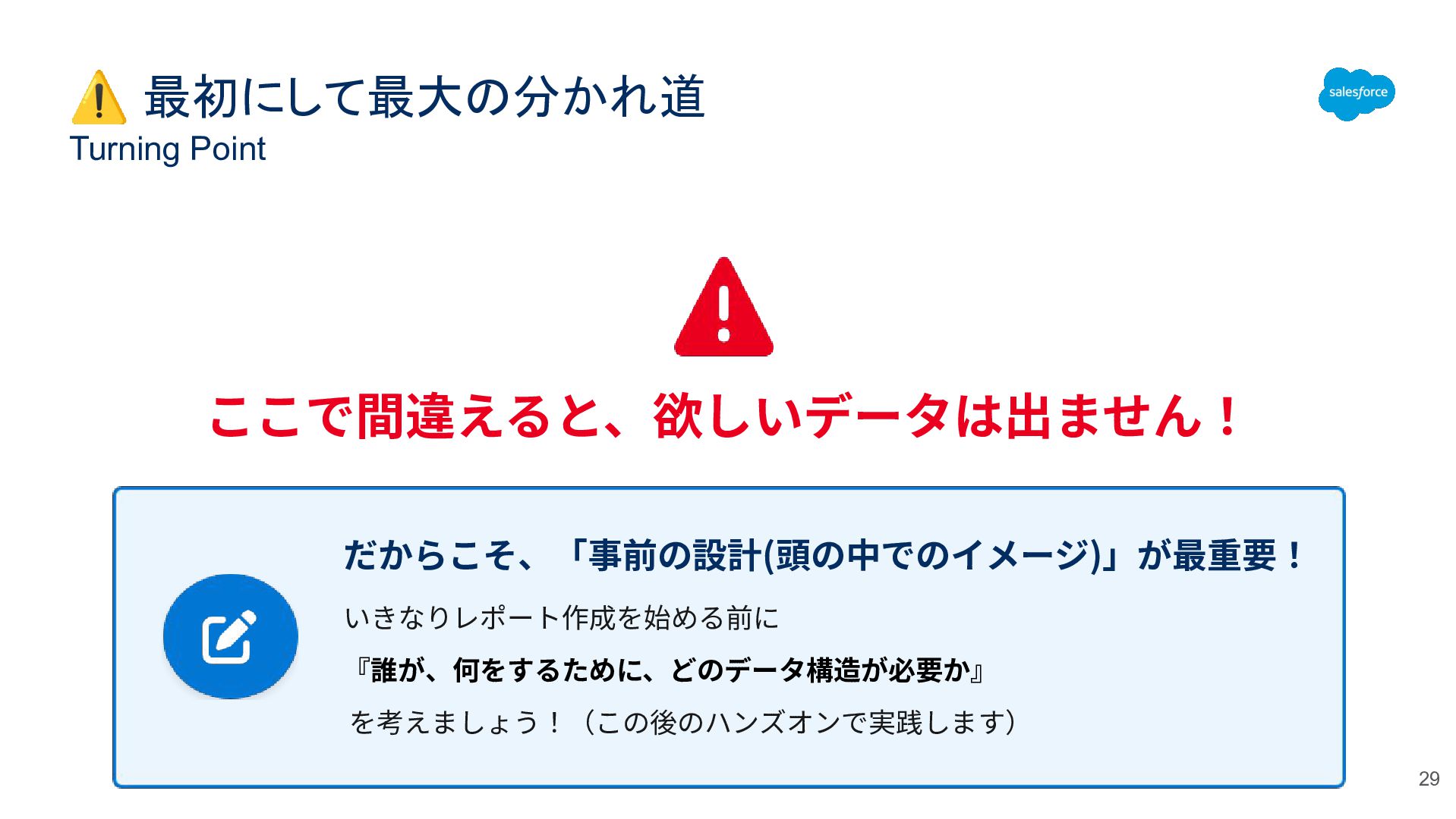⚠ 最初にして最大の分かれ道 Turning Point 29 ここで間違えると、欲しいデータは出ません! だからこそ、「事前の設計(頭の中でのイメージ)」が最重要! いきなりレポート作成を始める前に 『誰が、何をするために、どのデータ構造が必要か』 を考えましょう!(この後のハンズオンで実践します)