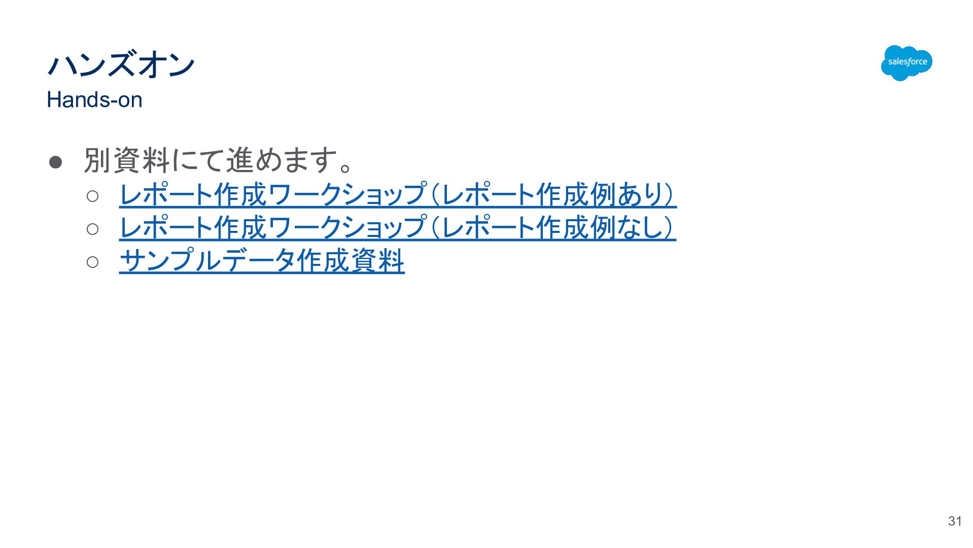 ハンズオン Hands-on 31 • 別資料にて進めます。 ◦ レポート作成ワークショップ(レポート作成例あり) ◦ レポート作成ワークショップ(レポート作成例なし) ◦