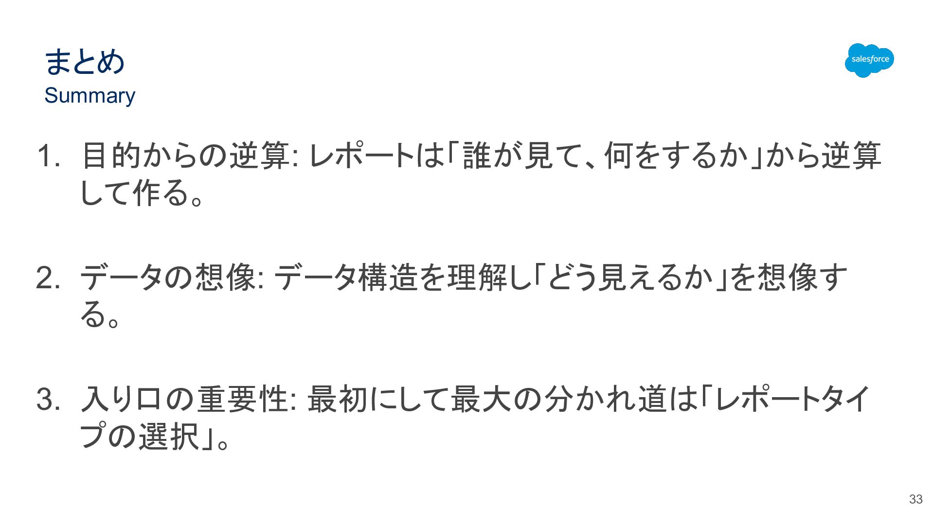 Summary まとめ 1. 目的からの逆算: レポートは「誰が見て、何をするか」から逆算 して作る。 2. データの想像: データ構造を理解し「どう見えるか」を想像す る。