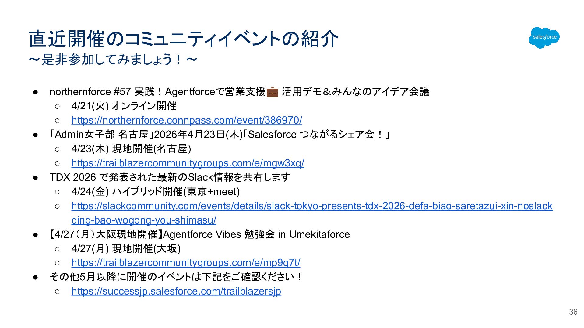 ◦ https://northernforce.connpass.com/event/386970/ • 「Admin女子部 名古屋」2026年4月23日(木)「Salesforce つながるシェア会!」 ◦ 4/23(木) 現地開催(名古屋) ◦ https://trailblazercommunitygroups.com/e/mgw3xq/ • TDX 2026 で発表された最新のSlack情報を共有します ◦ 4/24(金) ハイブリッド開催(東京+meet) ◦ https://slackcommunity.com/events/details/slack-tokyo-presents-tdx-2026-defa-biao-saretazui-xin-noslack qing-bao-wogong-you-shimasu/ • 【4/27(月)大阪現地開催】Agentforce Vibes 勉強会 in Umekitaforce ◦ 4/27(月) 現地開催(大坂) ◦ https://trailblazercommunitygroups.com/e/mp9q7t/ • その他5月以降に開催のイベントは下記をご確認ください! ◦ https://successjp.salesforce.com/trailblazersjp • 36