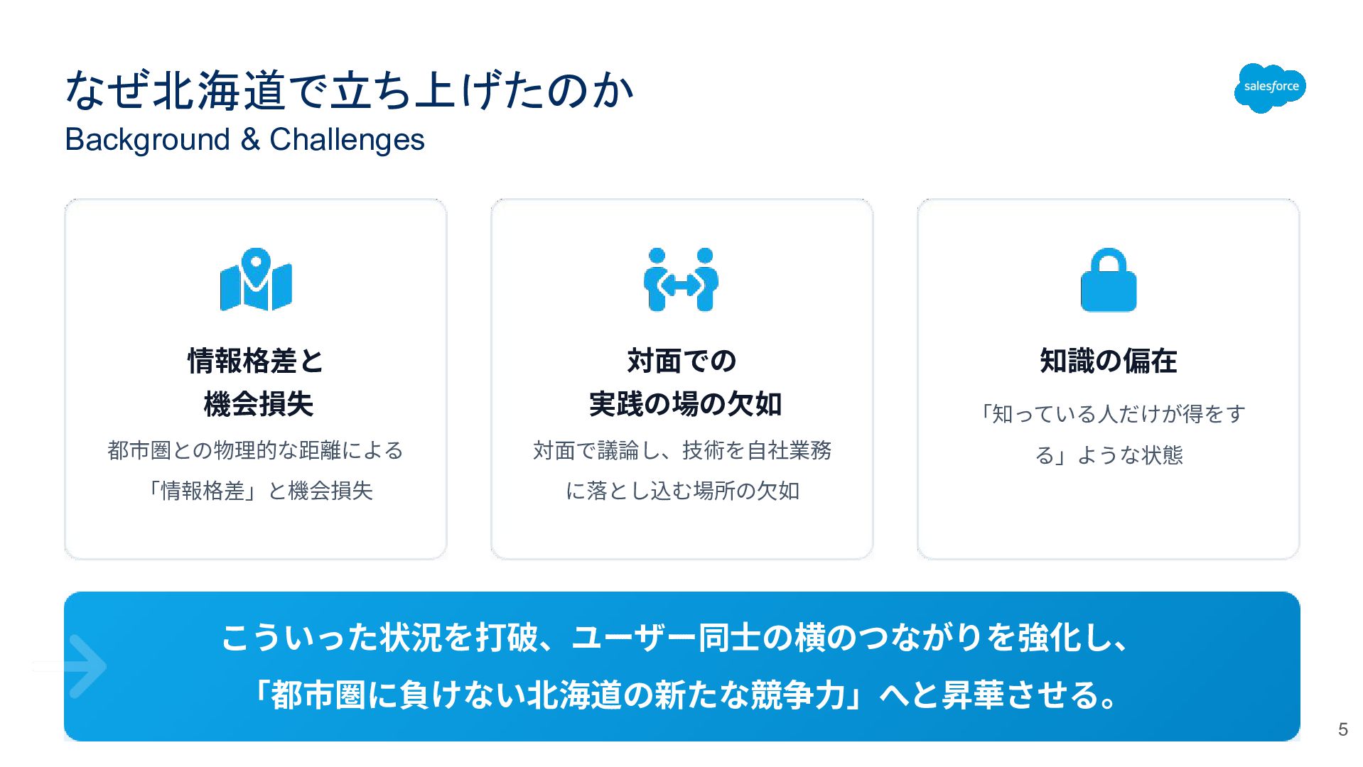なぜ北海道で立ち上げたのか Background & Challenges 情報格差と 機会損失 都市圏との物理的な距離による 「情報格差」と機会損失 対⾯での 実践の場の⽋如