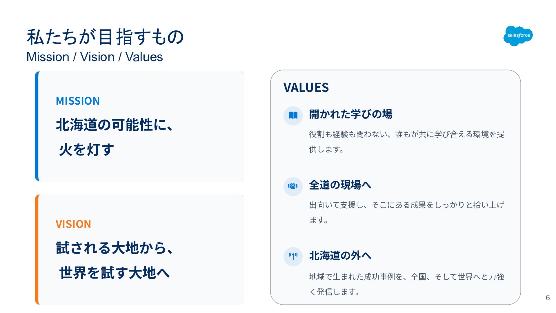 試される⼤地から、 世界を試す⼤地へ VALUES 役割も経験も問わない、誰もが共に学び合える環境を提 供します。 出向いて⽀援し、そこにある成果をしっかりと拾い上げ ます。 開かれた学びの場 全道の現場へ 北海道の外へ 地域で⽣まれた成功事例を、全国、そして世界へと⼒強 く発信します。 6
