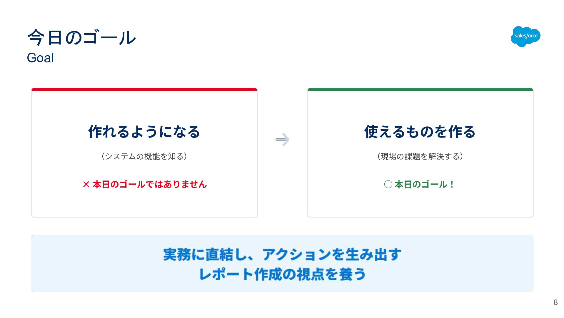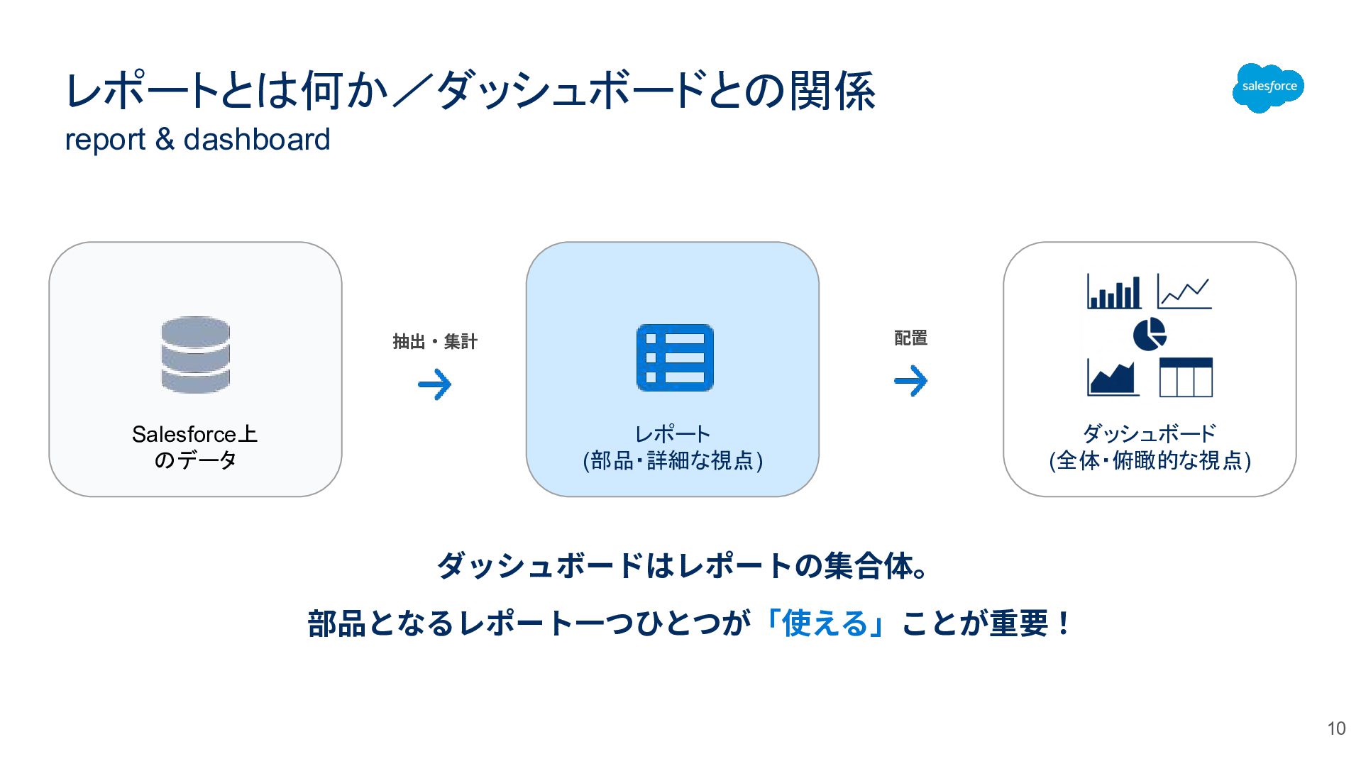 レポートとは何か/ダッシュボードとの関係 ダッシュボードはレポートの集合体。 部品となるレポート⼀つひとつが「使える」ことが重要! Salesforce上 のデータ レポート (部品・詳細な視点) ダッシュボード (全体・俯瞰的な視点) 抽出‧集計