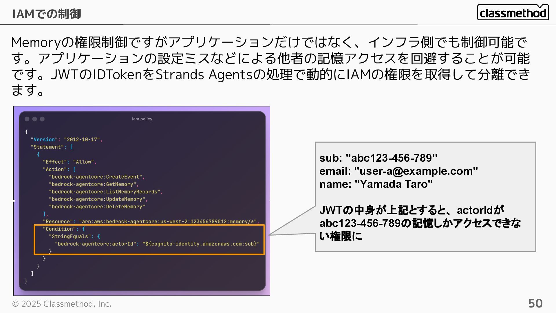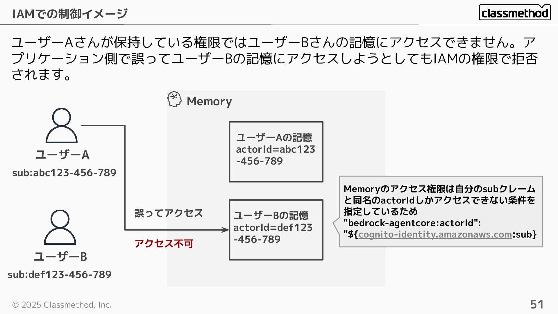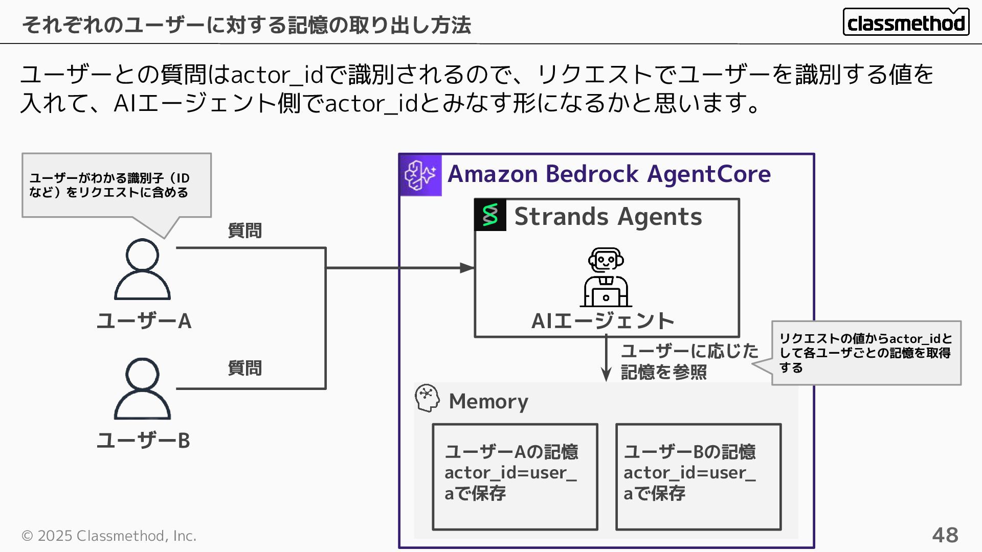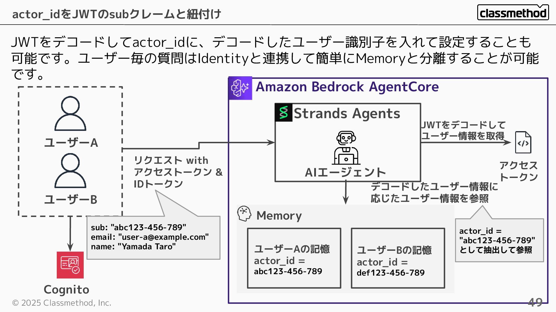 Bedrock AgentCore ユーザーA Strands Agents AIエージェント Memory ユーザーB ユーザーAの記憶 actor_id = abc123-456-789 Cognito アクセス トークン リクエスト with アクセストークン & IDトークン JWTをデコードして ユーザー情報を取得 デコードしたユーザー情報に 応じたユーザー情報を参照 sub: "abc123-456-789" email: "