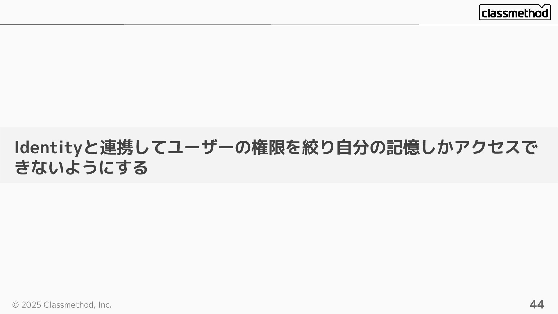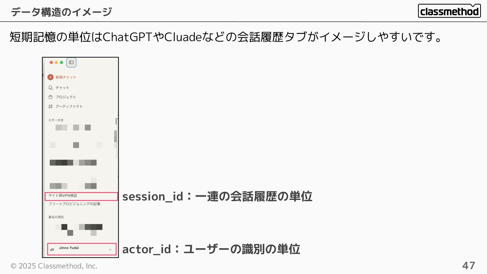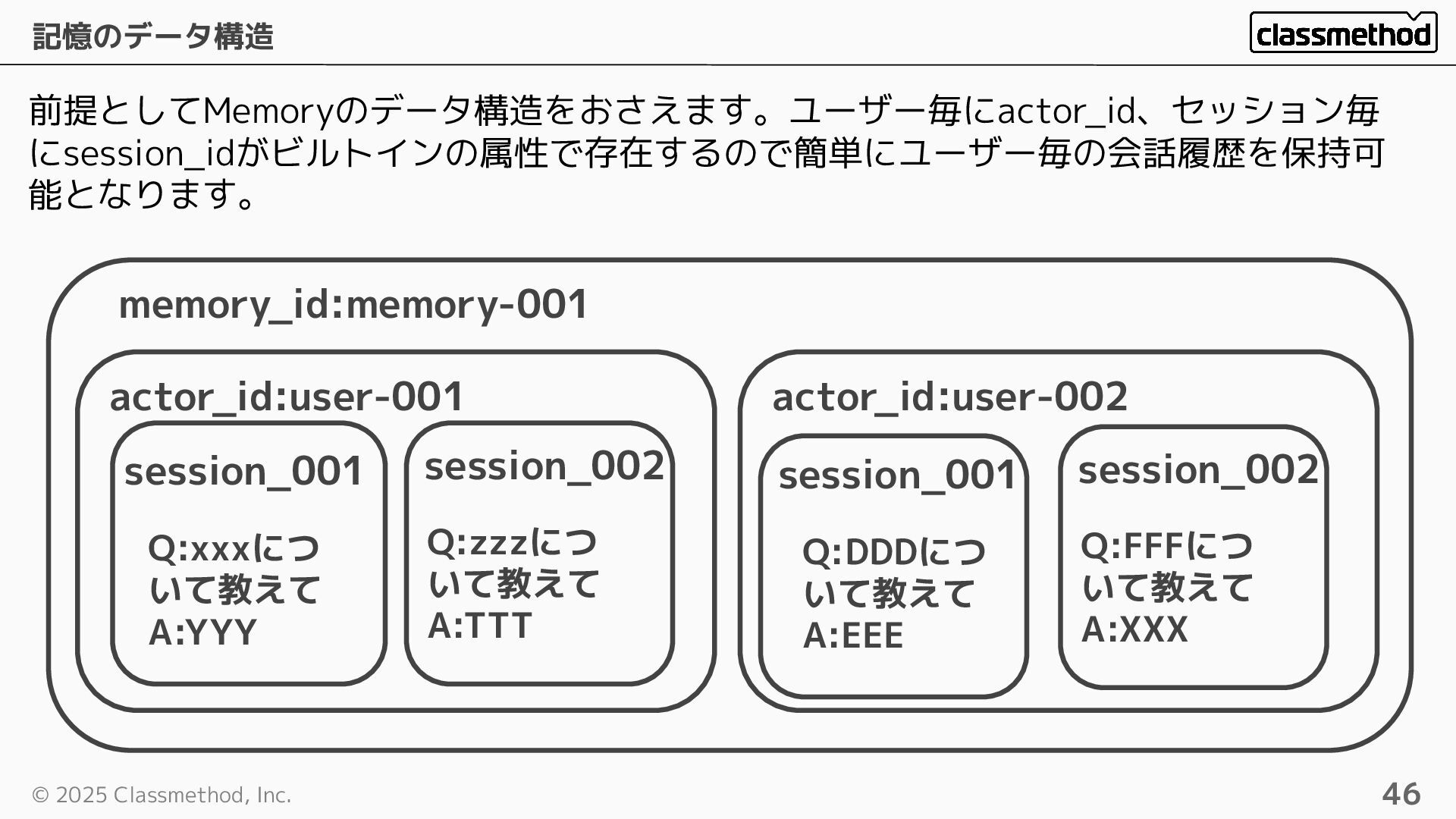 [email protected]" name: "Yamada Taro" actor_id = "abc123-456-789" として抽出して参照 ユーザーBの記憶 actor_id = def123-456-789