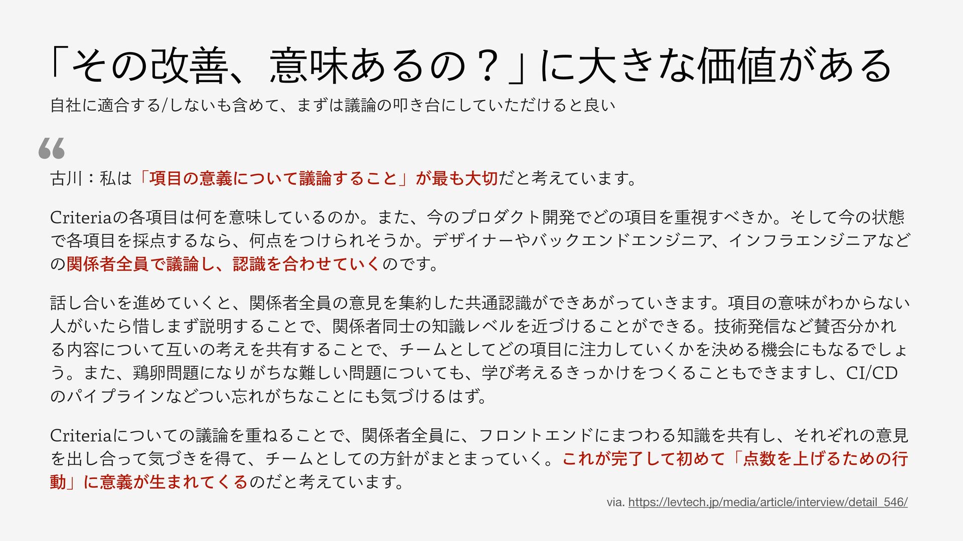ͷύΠϓϥΠϯͳͲ͍ͭΕ͕ͪͳ͜ͱʹؾ͚ͮΔͣɻ $SJUFSJBʹ͍ͭͯͷٞΛॏͶΔ͜ͱͰɺؔऀશһʹɺϑϩϯτΤϯυʹ·ͭΘΔࣝΛڞ༗͠ɺͦΕͧΕͷҙݟ Λग़͠߹ͬͯؾ͖ͮΛಘͯɺνʔϜͱͯ͠ͷํ͕·ͱ·͍ͬͯ͘ɻ͜Ε͕ྃͯ͠ॳΊͯʮΛ্͛ΔͨΊͷߦ ಈʯʹҙ͕ٛੜ·Εͯ͘Δͷͩͱߟ͍͑ͯ·͢ɻ via. https://levtech.jp/media/article/interview/detail_546/ l