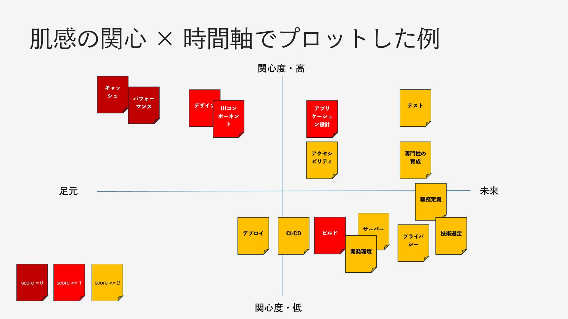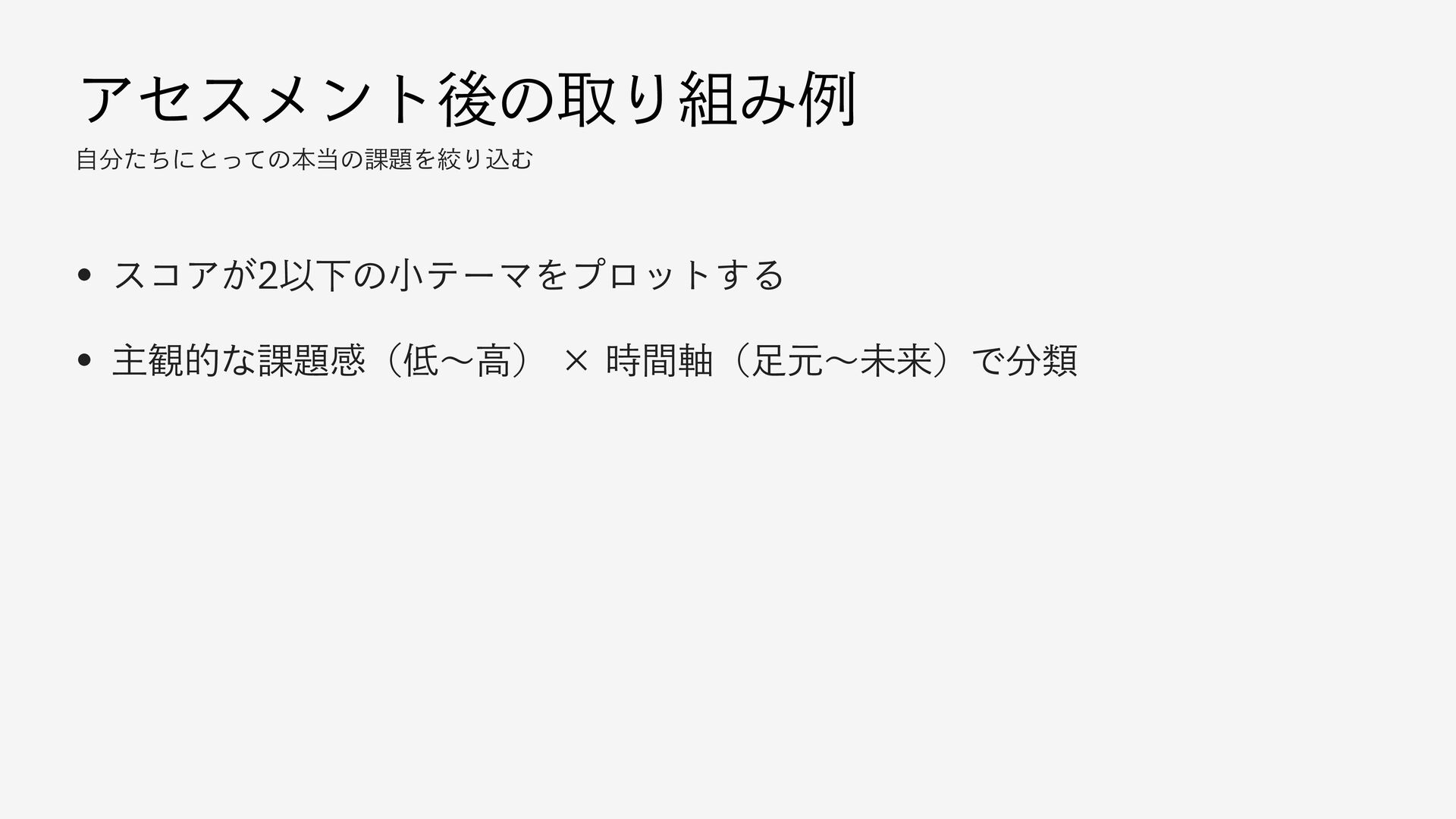 ΞηεϝϯτޙͷऔΓΈྫ ࣗͨͪʹͱͬͯͷຊͷ՝ΛߜΓࠐΉ w είΞ͕ҎԼͷখςʔϚΛϓϩοτ͢Δ w ओ؍తͳ՝ײʢʙߴʣʷ࣌ؒ࣠ʢݩʙະདྷʣͰྨ