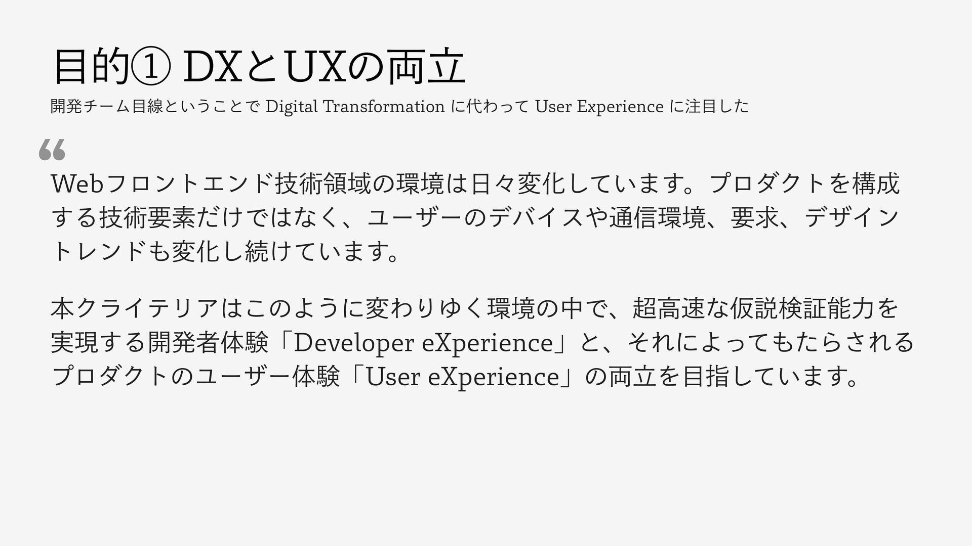 తᶃ%9ͱ69ͷཱ྆ ։ൃνʔϜઢͱ͍͏͜ͱͰ%JHJUBM5SBOTGPSNBUJPOʹΘͬͯ6TFS&YQFSJFODFʹͨ͠ 8FCϑϩϯτΤϯυٕज़ྖҬͷڥʑมԽ͍ͯ͠·͢ɻϓϩμΫτΛߏ ͢Δٕज़ཁૉ͚ͩͰͳ͘ɺϢʔβʔͷσόΠε௨৴ڥɺཁٻɺσβΠϯ τϨϯυมԽ͠ଓ͚͍ͯ·͢ɻ ຊΫϥΠςϦΞ͜ͷΑ͏ʹมΘΓΏ͘ڥͷதͰɺߴͳԾઆݕূೳྗΛ ࣮ݱ͢Δ։ൃऀମݧʮ%FWFMPQFSF9QFSJFODFʯͱɺͦΕʹΑͬͯͨΒ͞ΕΔ ϓϩμΫτͷϢʔβʔମݧʮ6TFSF9QFSJFODFʯͷཱ྆Λࢦ͍ͯ͠·͢ɻ l