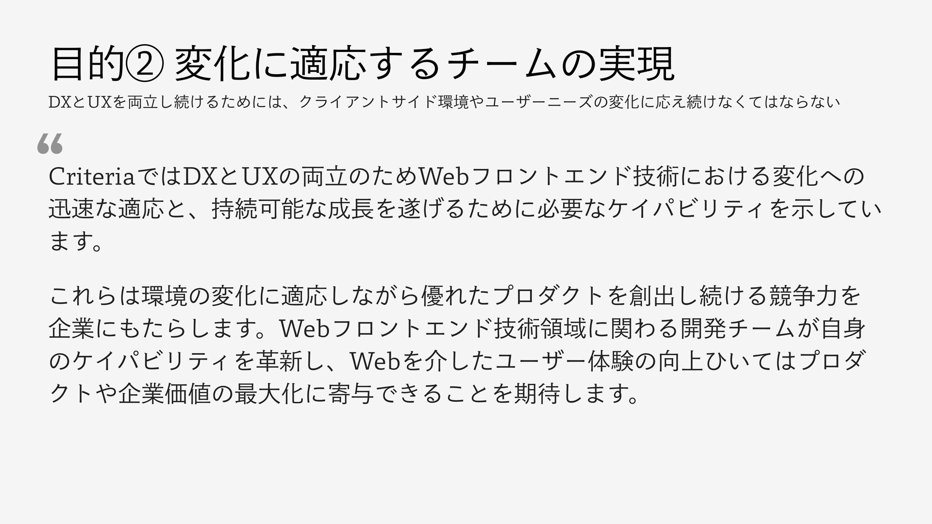 తᶄมԽʹదԠ͢ΔνʔϜͷ࣮ݱ %9ͱ69Λཱ྆͠ଓ͚ΔͨΊʹɺΫϥΠΞϯταΠυڥϢʔβʔχʔζͷมԽʹԠ͑ଓ͚ͳͯ͘ͳΒͳ͍ $SJUFSJBͰ%9ͱ69ͷཱ྆ͷͨΊ8FCϑϩϯτΤϯυٕज़ʹ͓͚ΔมԽͷ ਝͳదԠͱɺ࣋ଓՄೳͳΛ͛ΔͨΊʹඞཁͳέΠύϏϦςΟΛ͍ࣔͯ͠ ·͢ɻ ͜ΕΒڥͷมԽʹదԠ͠ͳ͕Β༏ΕͨϓϩμΫτΛग़͠ଓ͚Δڝ૪ྗΛ اۀʹͨΒ͠·͢ɻ8FCϑϩϯτΤϯυٕज़ྖҬʹؔΘΔ։ൃνʔϜ͕ࣗ ͷέΠύϏϦςΟΛֵ৽͠ɺ8FCΛհͨ͠Ϣʔβʔମݧͷ্ͻ͍ͯϓϩμ ΫτاۀՁͷ࠷େԽʹد༩Ͱ͖Δ͜ͱΛظ͠·͢ɻ l