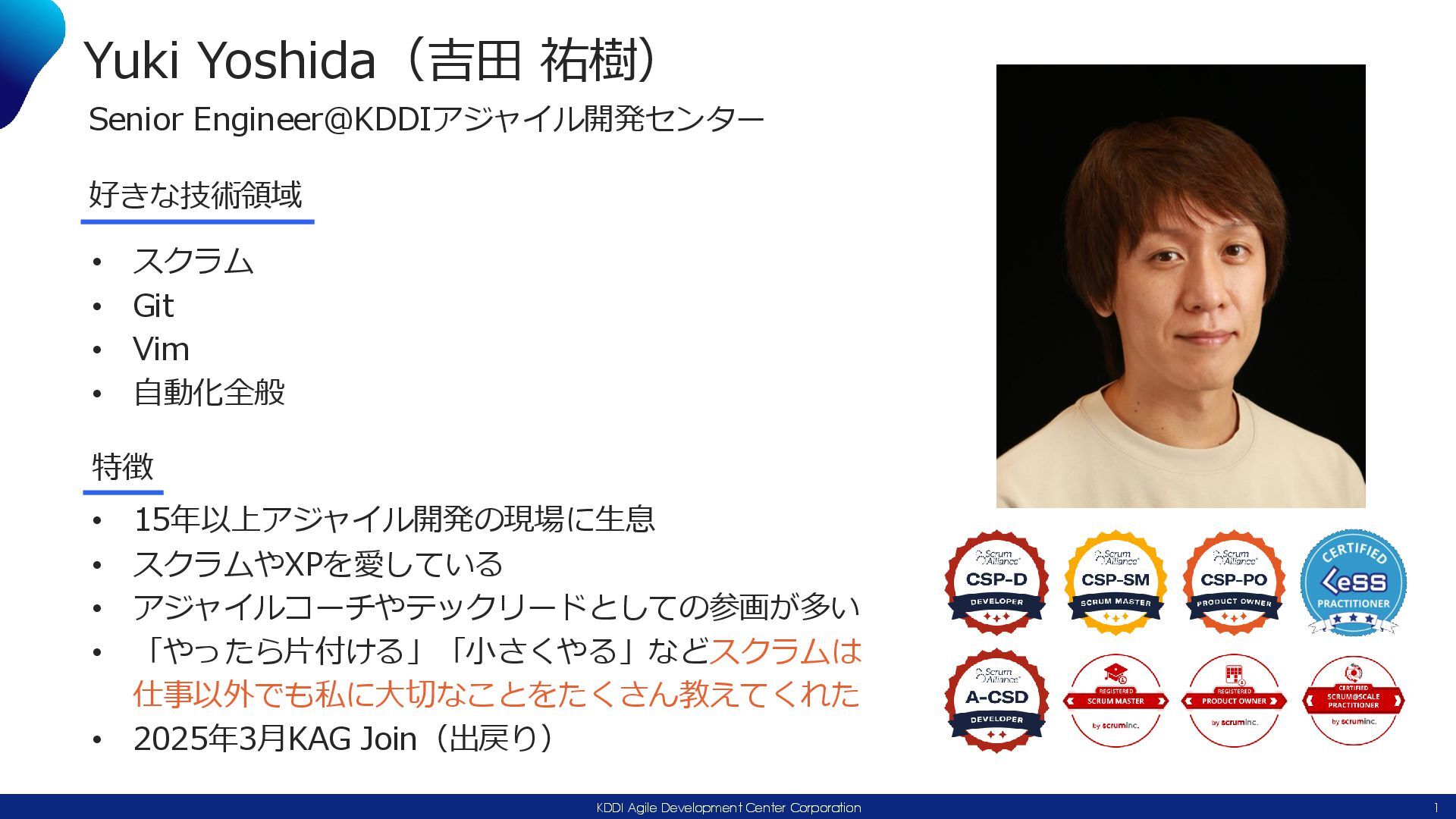 Engineer@KDDIアジャイル開発センター • 15年以上アジャイル開発の現場に生息 • スクラムやXPを愛している • アジャイルコーチやテックリードとしての参画が多い • 「やったら片付ける」「小さくやる」などスクラムは 仕事以外でも私に大切なことをたくさん教えてくれた • 2025年3月KAG Join(出戻り) 特徴 好きな技術領域 • スクラム • Git • Vim • 自動化全般