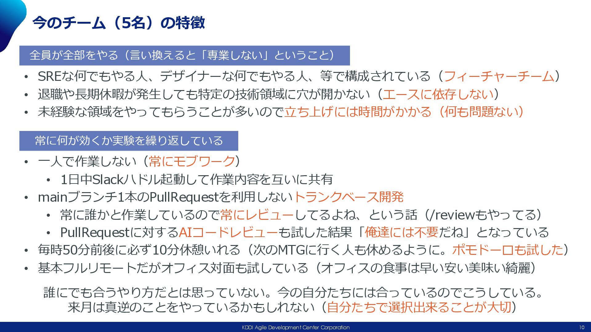退職や長期休暇が発生しても特定の技術領域に穴が開かない(エースに依存しない) • 未経験な領域をやってもらうことが多いので立ち上げには時間がかかる(何も問題ない) • 一人で作業しない(常にモブワーク) • 1日中Slackハドル起動して作業内容を互いに共有 • mainブランチ1本のPullRequestを利用しないトランクベース開発 • 常に誰かと作業しているので常にレビューしてるよね、という話(/reviewもやってる) • PullRequestに対するAIコードレビューも試した結果「俺達には不要だね」となっている • 毎時50分前後に必ず10分休憩いれる(次のMTGに行く人も休めるように。ポモドーロも試した) • 基本フルリモートだがオフィス対面も試している(オフィスの食事は早い安い美味い綺麗) 常に何が効くか実験を繰り返している 今のチーム(5名)の特徴 誰にでも合うやり方だとは思っていない。今の自分たちには合っているのでこうしている。 来月は真逆のことをやっているかもしれない(自分たちで選択出来ることが大切)