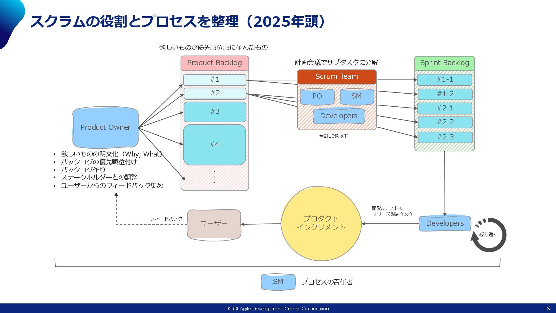 #3 ・ ・ ・ #4 Product Owner Sprint Backlog #1-1 #1-2 #2-1 #2-2 #2-3 • 欲しいものの明文化(Why, What) • バックログの優先順位付け • バックログ作り • ステークホルダーとの調整 PO SM Developers Scrum Team 計画会議でサブタスクに分解 Developers 開発&テスト& リリース&振り返り プロダクト インクリメント ユーザー フィードバック SM プロセスの責任者 合計10名以下 • ユーザーからのフィードバック集め 欲しいものが優先順位順に並んだもの #1 #2 スクラムの役割とプロセスを整理(2025年頭) 繰り返す