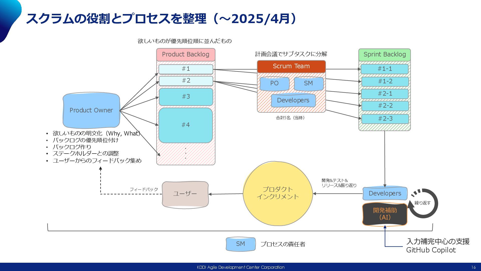 #3 ・ ・ ・ #4 Product Owner Sprint Backlog #1-1 #1-2 #2-1 #2-2 #2-3 • 欲しいものの明文化(Why, What) • バックログの優先順位付け • バックログ作り • ステークホルダーとの調整 PO SM Developers Scrum Team 計画会議でサブタスクに分解 Developers プロダクト インクリメント ユーザー フィードバック SM プロセスの責任者 合計5名(当時) • ユーザーからのフィードバック集め 欲しいものが優先順位順に並んだもの #1 #2 スクラムの役割とプロセスを整理(〜2025/4月) 繰り返す 開発補助 (AI) 入力補完中心の支援 GitHub Copilot 開発&テスト& リリース&振り返り