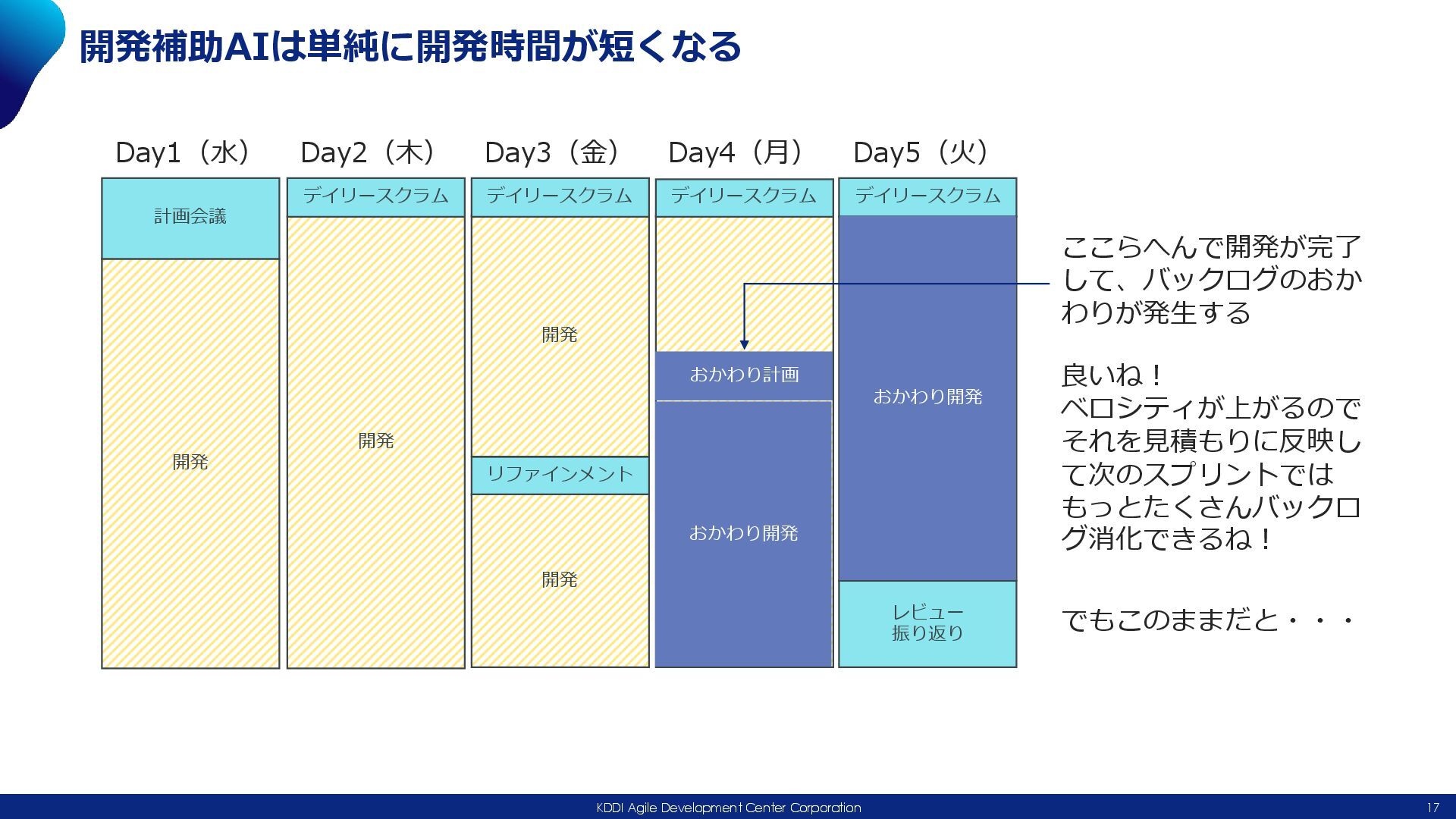Day5(火) 開発 計画会議 開発 デイリースクラム リファインメント 開発 開発 デイリースクラム 開発 デイリースクラム デイリースクラム 開発 レビュー 振り返り おかわり計画 ここらへんで開発が完了 して、バックログのおか わりが発生する 良いね! ベロシティが上がるので それを見積もりに反映し て次のスプリントでは もっとたくさんバックロ グ消化できるね! でもこのままだと・・・ おかわり開発 おかわり開発 開発補助AIは単純に開発時間が短くなる