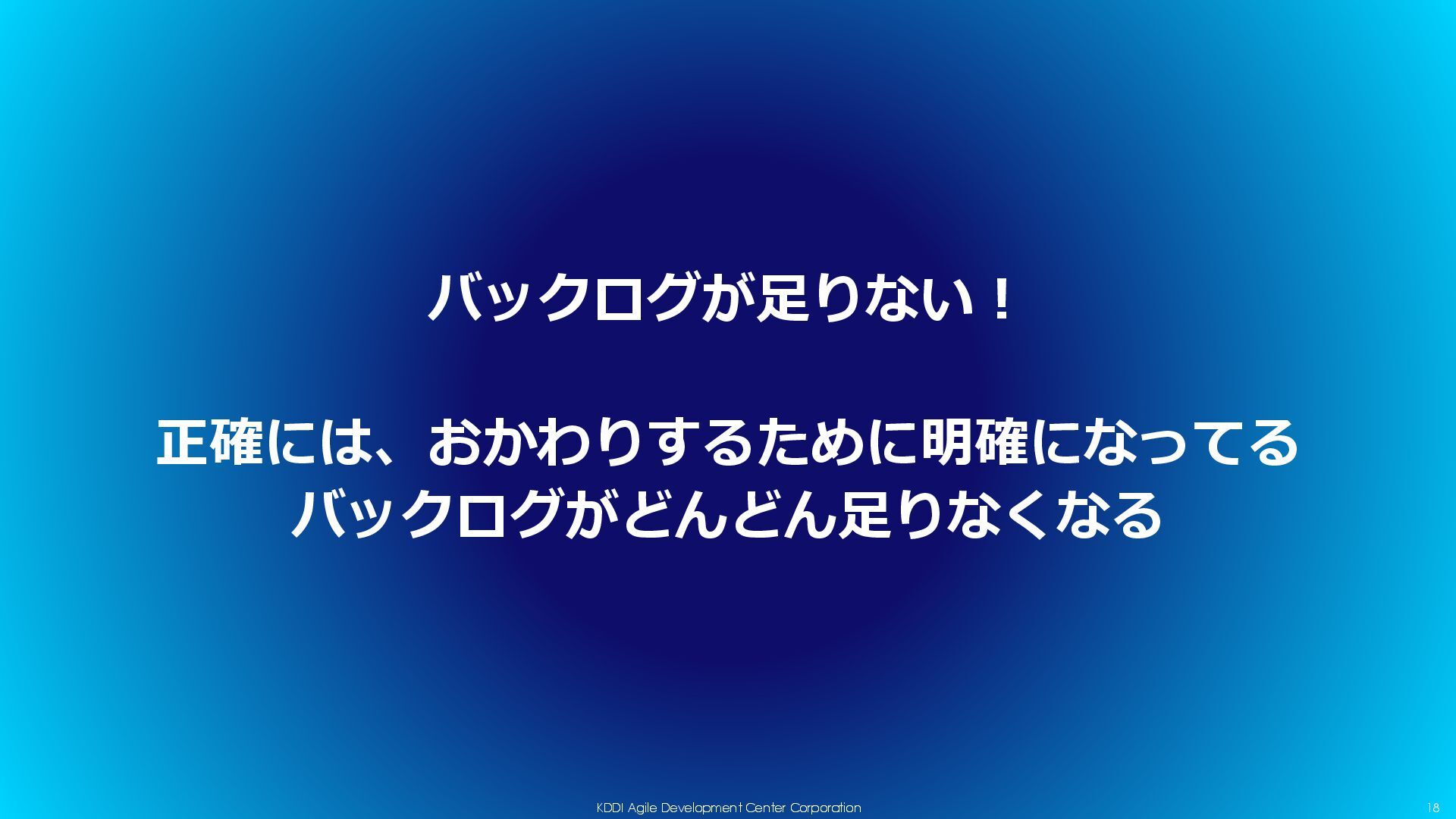 18 KDDI Agile Development Center Corporation バックログが足りない! 正確には、おかわりするために明確になってる バックログがどんどん足りなくなる