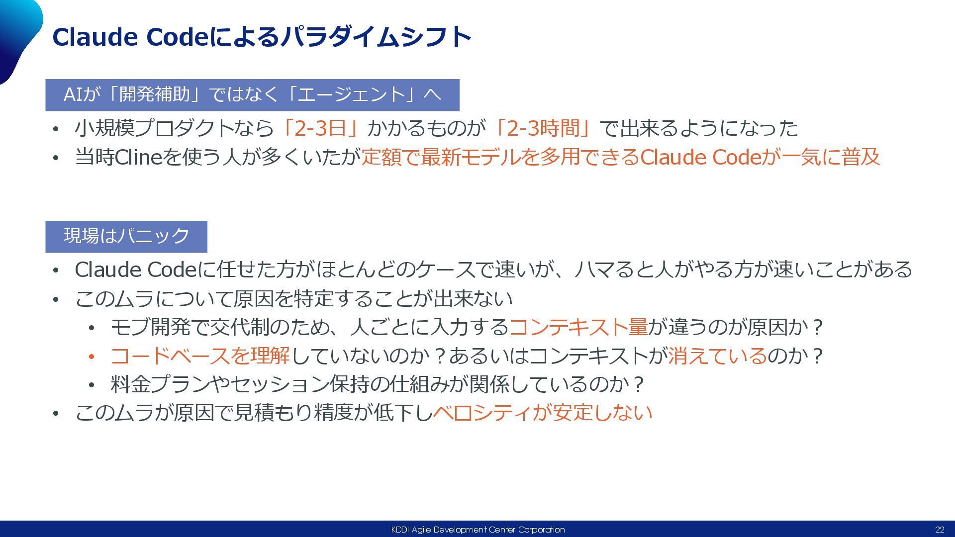 小規模プロダクトなら「2-3日」かかるものが「2-3時間」で出来るようになった • 当時Clineを使う人が多くいたが定額で最新モデルを多用できるClaude Codeが一気に普及 現場はパニック • Claude Codeに任せた方がほとんどのケースで速いが、ハマると人がやる方が速いことがある • このムラについて原因を特定することが出来ない • モブ開発で交代制のため、人ごとに入力するコンテキスト量が違うのが原因か? • コードベースを理解していないのか?あるいはコンテキストが消えているのか? • 料金プランやセッション保持の仕組みが関係しているのか? • このムラが原因で見積もり精度が低下しベロシティが安定しない