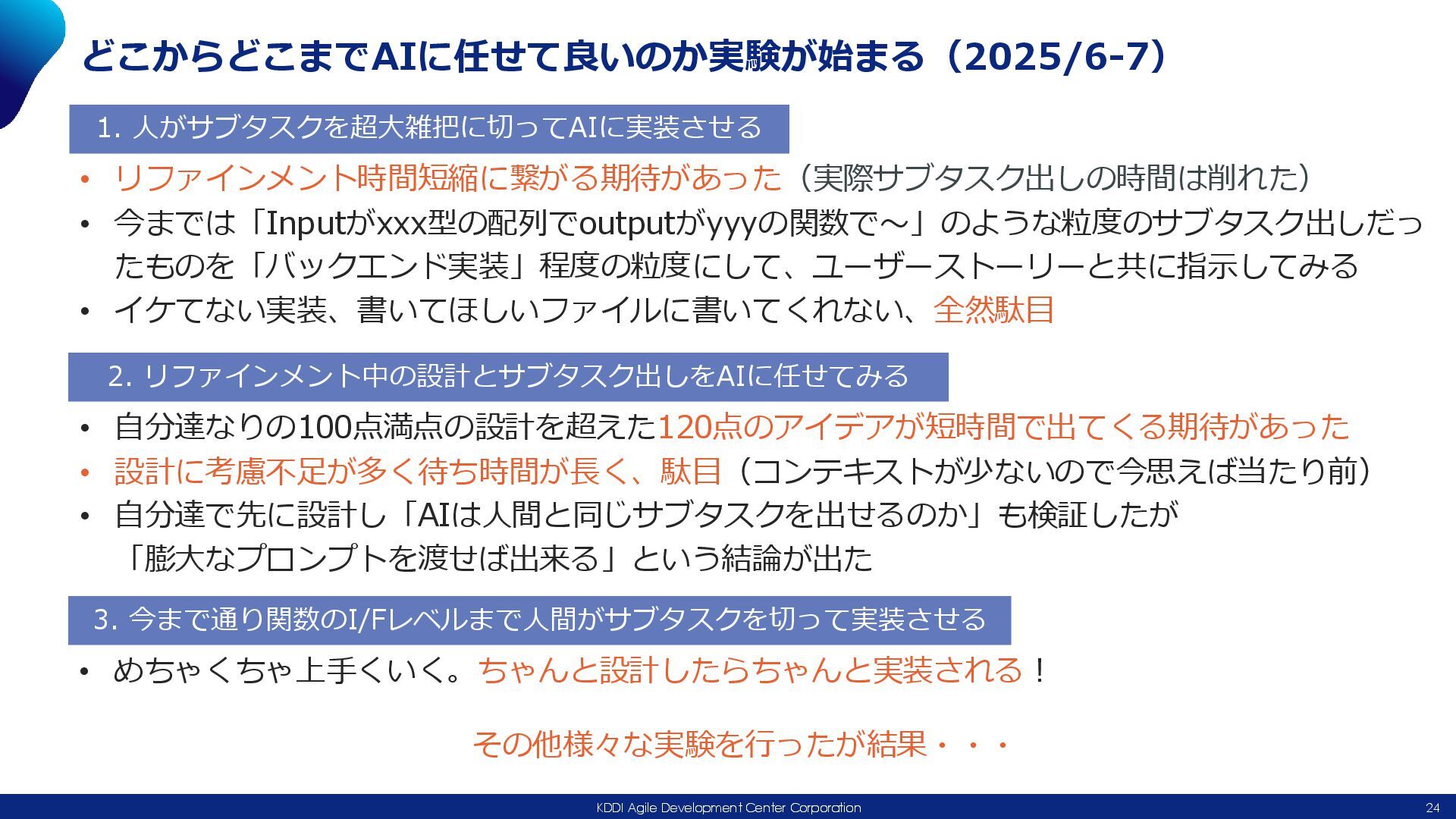 24 KDDI Agile Development Center Corporation どこからどこまでAIに任せて良いのか実験が始まる(2025/6-7) 1. 人がサブタスクを超大雑把に切ってAIに実装させる •