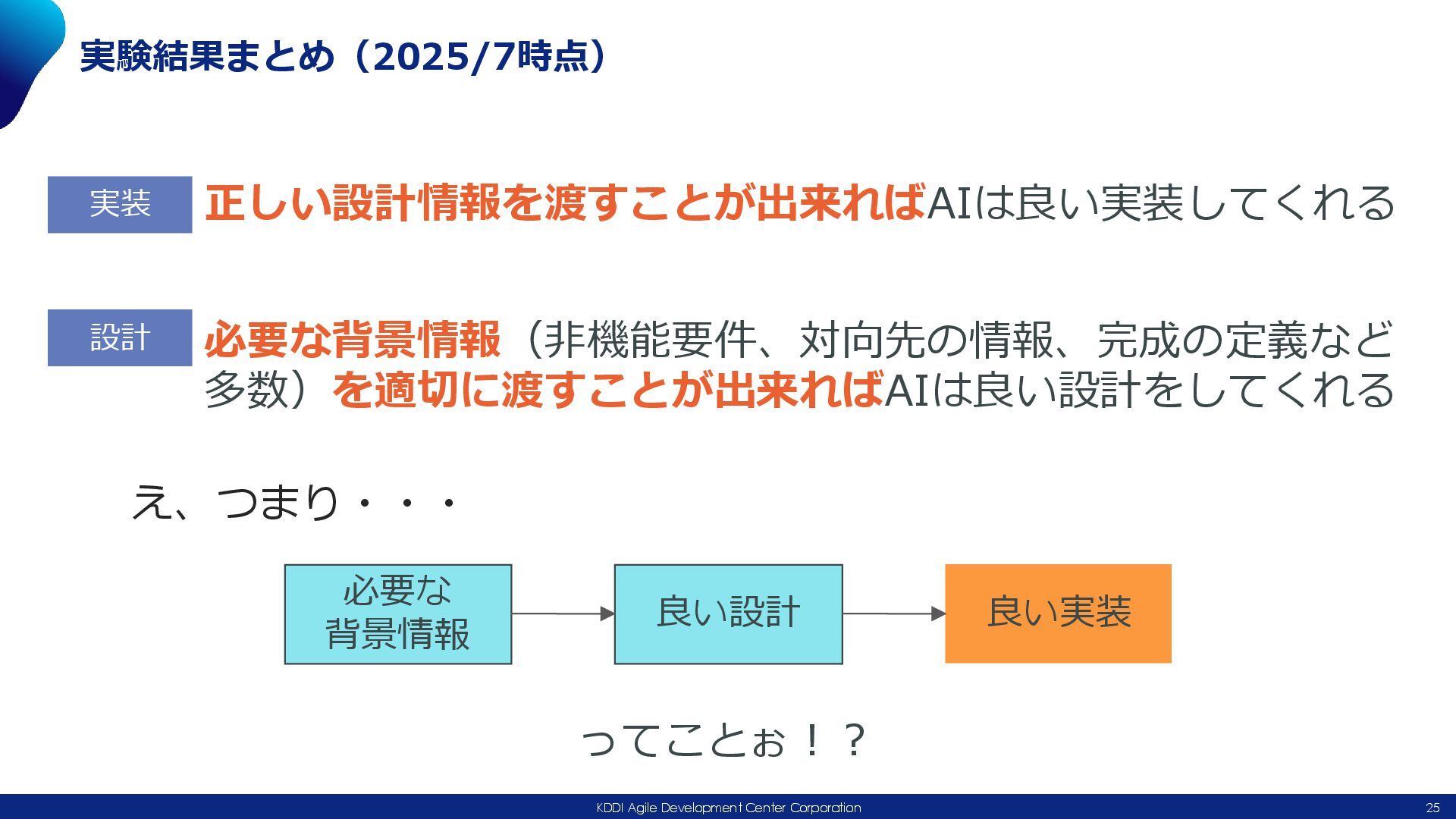 25 KDDI Agile Development Center Corporation 実験結果まとめ(2025/7時点) え、つまり・・・ 実装 正しい設計情報を渡すことが出来ればAIは良い実装してくれる