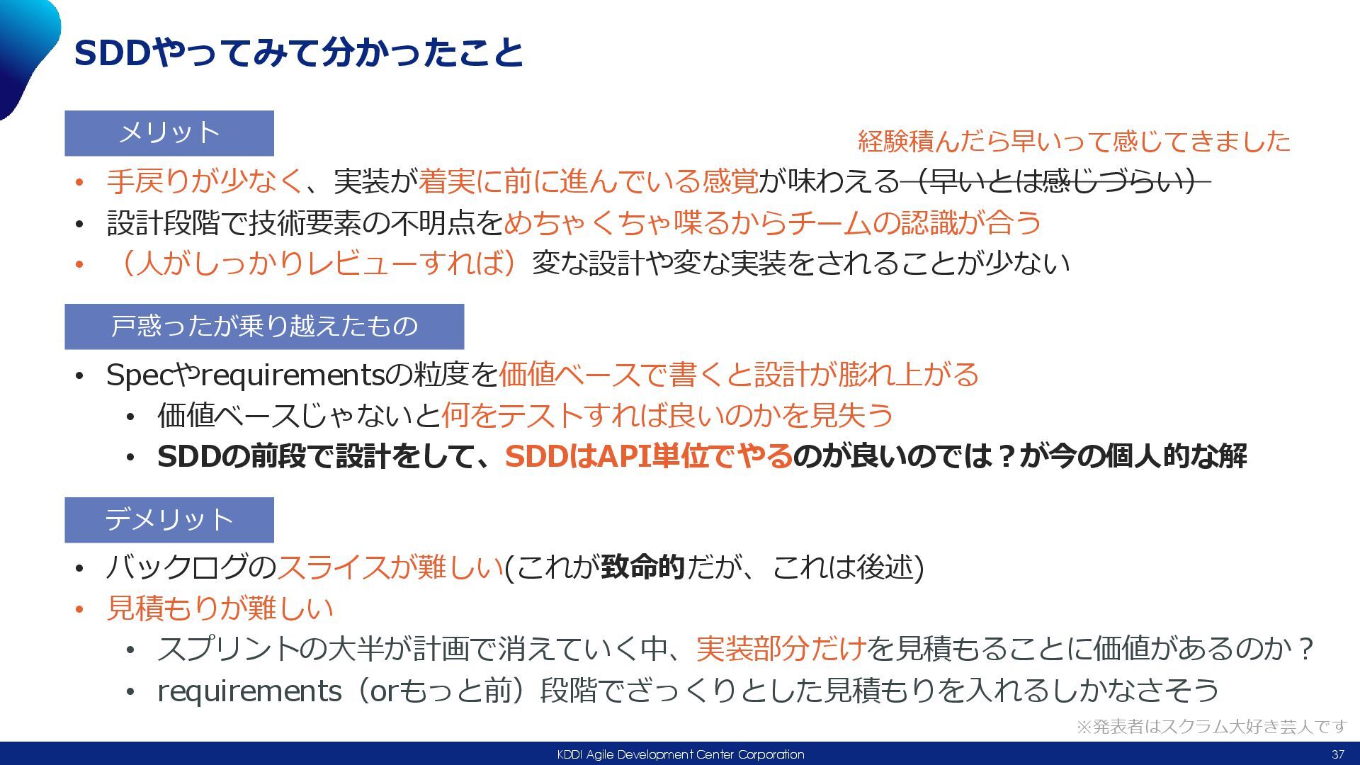 37 KDDI Agile Development Center Corporation SDDやってみて分かったこと メリット • 手戻りが少なく、実装が着実に前に進んでいる感覚が味わえる(早いとは感じづらい)