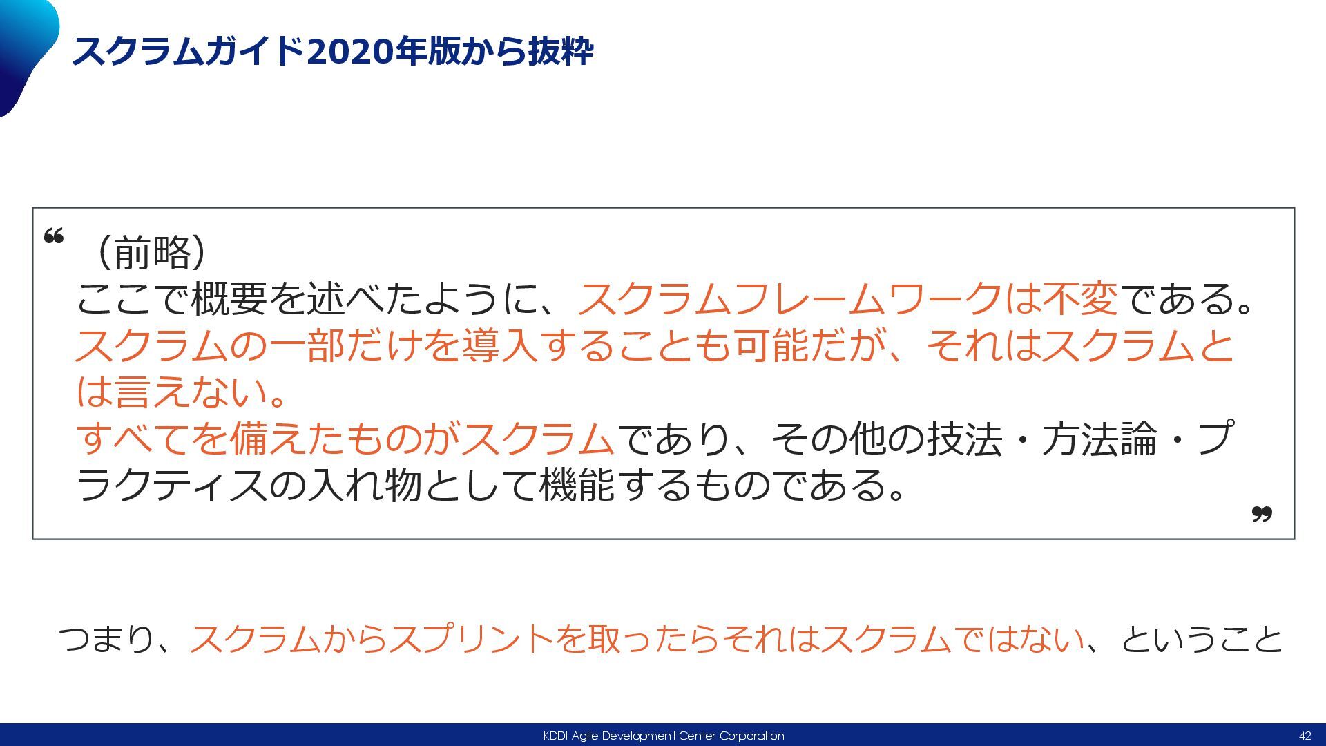 42 KDDI Agile Development Center Corporation スクラムガイド2020年版から抜粋 (前略) ここで概要を述べたように、スクラムフレームワークは不変である。 スクラムの一部だけを導入することも可能だが、それはスクラムと