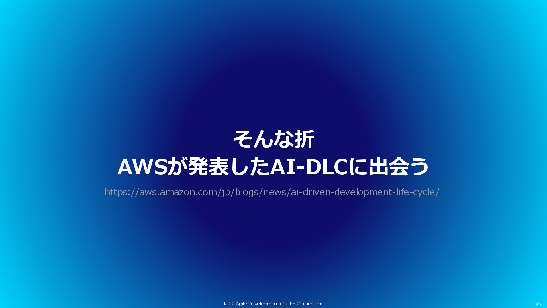 43 KDDI Agile Development Center Corporation そんな折 AWSが発表したAI-DLCに出会う https://aws.amazon.com/jp/blogs/news/ai-driven-development-life-cycle/