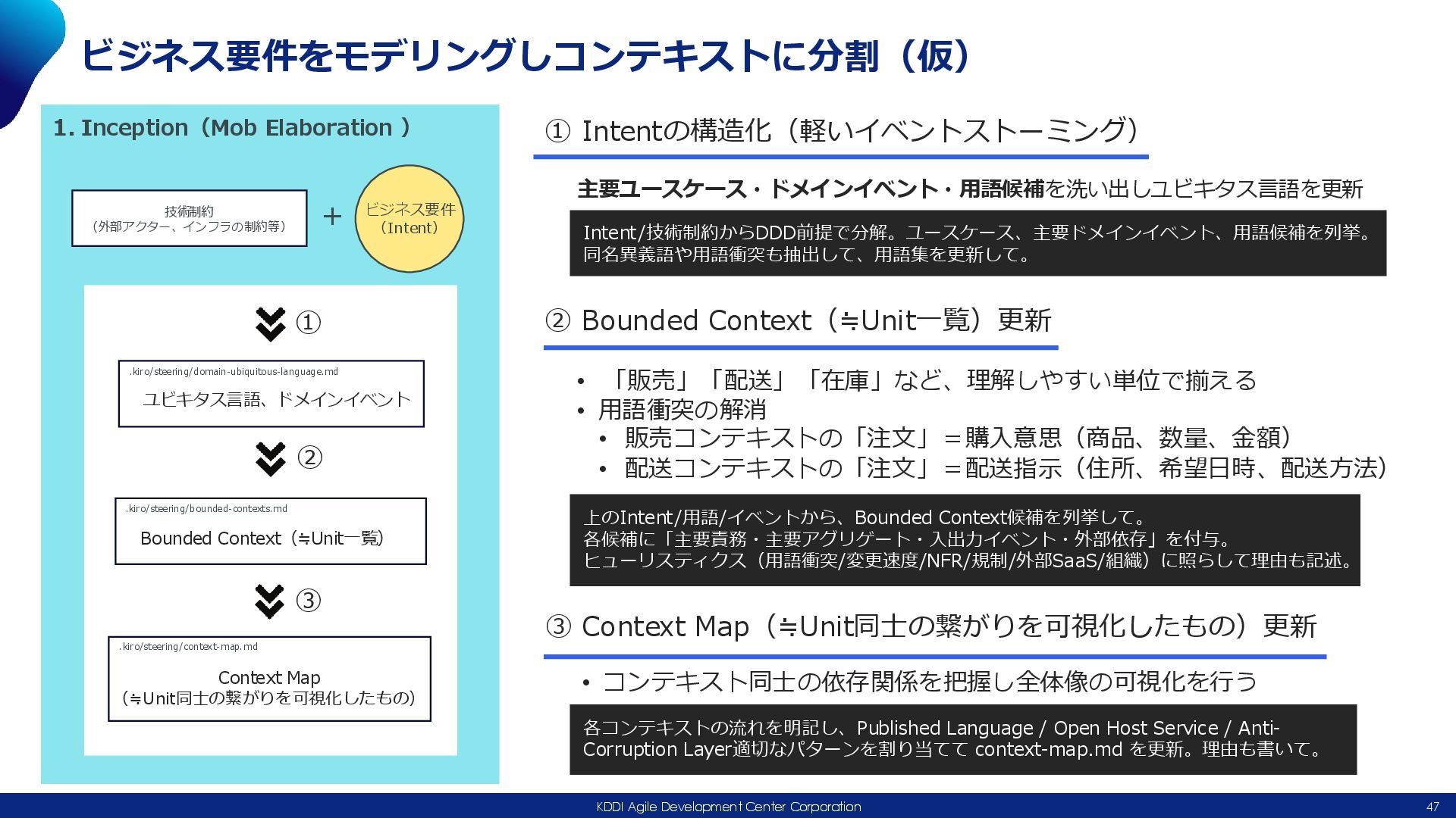 同名異義語や用語衝突も抽出して、用語集を更新して。 主要ユースケース・ドメインイベント・用語候補を洗い出しユビキタス言語を更新 上のIntent/用語/イベントから、Bounded Context候補を列挙して。 各候補に「主要責務・主要アグリゲート・入出力イベント・外部依存」を付与。 ヒューリスティクス(用語衝突/変更速度/NFR/規制/外部SaaS/組織)に照らして理由も記述。 • コンテキスト同士の依存関係を把握し全体像の可視化を行う 各コンテキストの流れを明記し、Published Language / Open Host Service / Anti- Corruption Layer適切なパターンを割り当てて context-map.md を更新。理由も書いて。 ② Bounded Context(≒Unit一覧)更新 ③ Context Map(≒Unit同士の繋がりを可視化したもの)更新 • 「販売」「配送」「在庫」など、理解しやすい単位で揃える • 用語衝突の解消 • 販売コンテキストの「注文」=購入意思(商品、数量、金額) • 配送コンテキストの「注文」=配送指示(住所、希望日時、配送方法) 1. Inception(Mob Elaboration ) .kiro/steering/domain-ubiquitous-language.md ユビキタス言語、ドメインイベント .kiro/steering/bounded-contexts.md Bounded Context(≒Unit一覧) .kiro/steering/context-map.md Context Map (≒Unit同士の繋がりを可視化したもの) ① ② ③ 技術制約 (外部アクター、インフラの制約等) + ビジネス要件 (Intent)