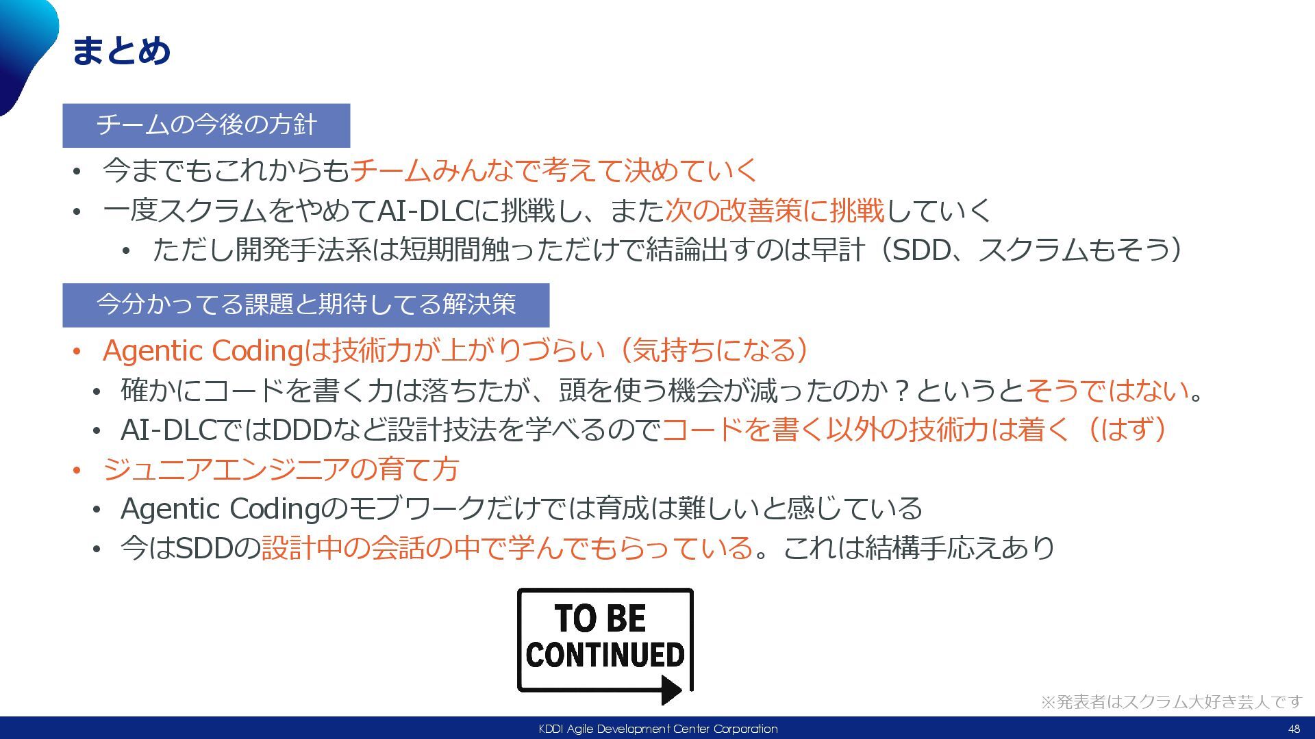 一度スクラムをやめてAI-DLCに挑戦し、また次の改善策に挑戦していく • ただし開発手法系は短期間触っただけで結論出すのは早計(SDD、スクラムもそう) チームの今後の方針 今分かってる課題と期待してる解決策 • Agentic Codingは技術力が上がりづらい(気持ちになる) • 確かにコードを書く力は落ちたが、頭を使う機会が減ったのか?というとそうではない。 • AI-DLCではDDDなど設計技法を学べるのでコードを書く以外の技術力は着く(はず) • ジュニアエンジニアの育て方 • Agentic Codingのモブワークだけでは育成は難しいと感じている • 今はSDDの設計中の会話の中で学んでもらっている。これは結構手応えあり ※発表者はスクラム大好き芸人です