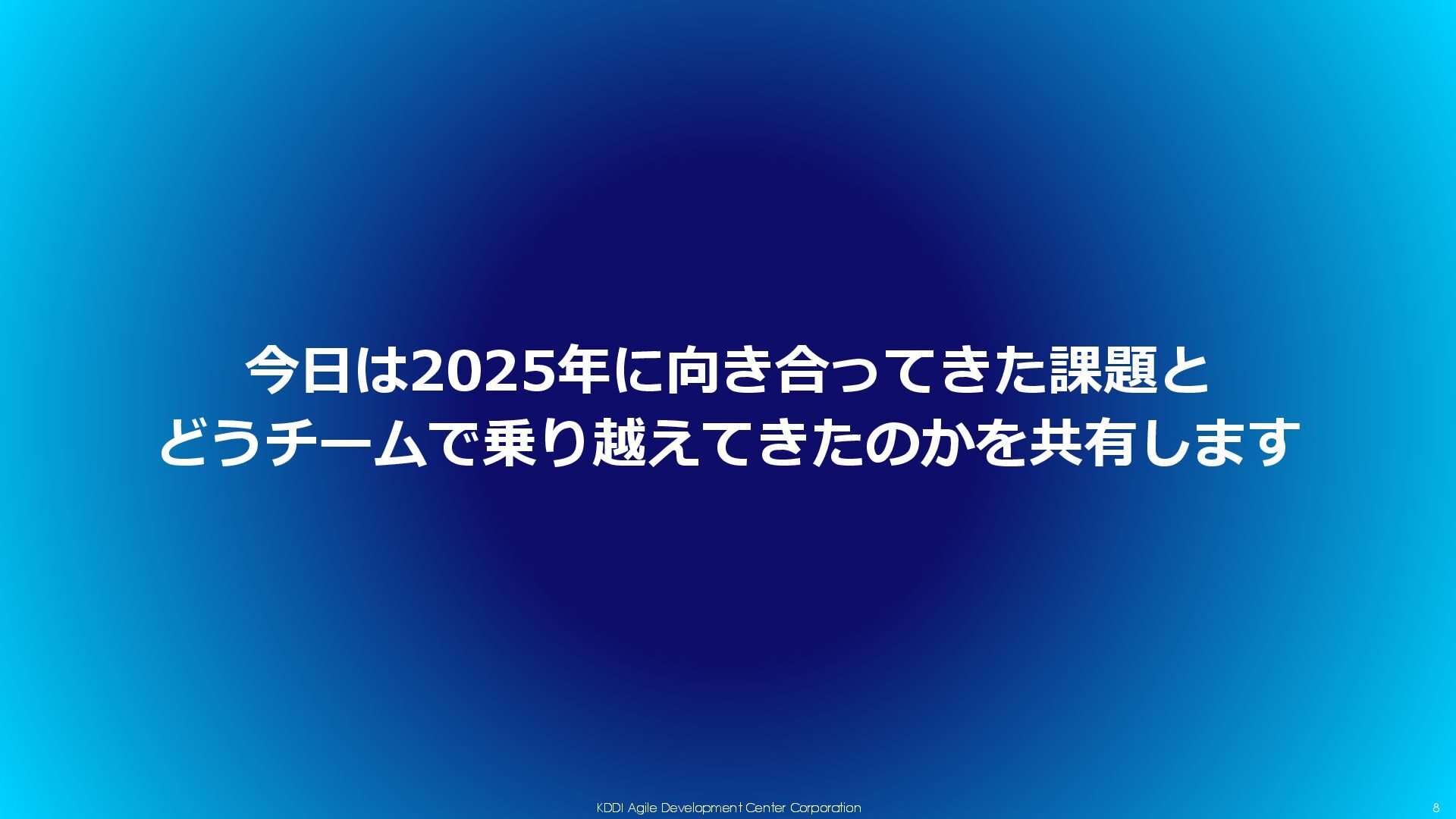 8 KDDI Agile Development Center Corporation 今日は2025年に向き合ってきた課題と どうチームで乗り越えてきたのかを共有します