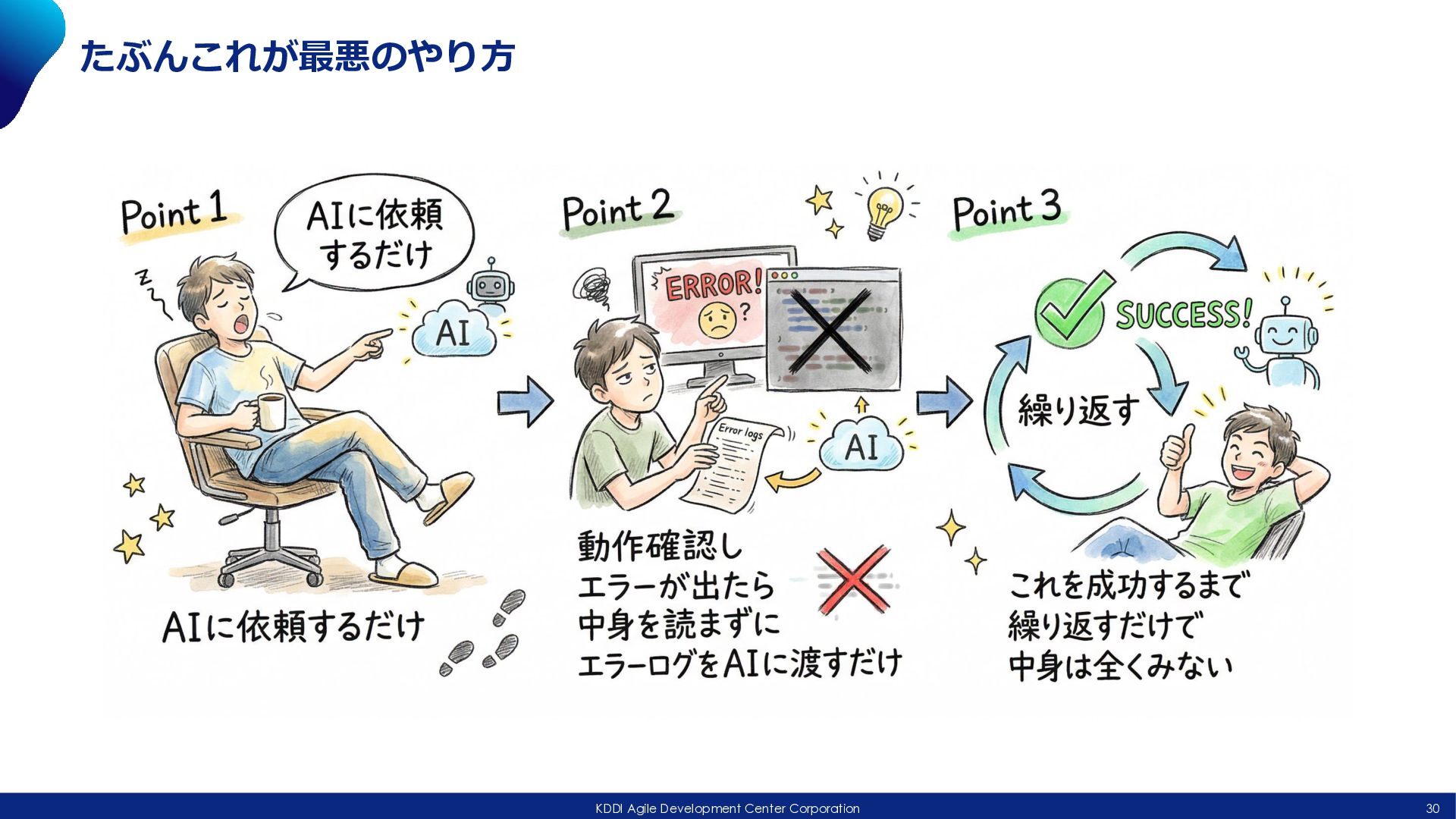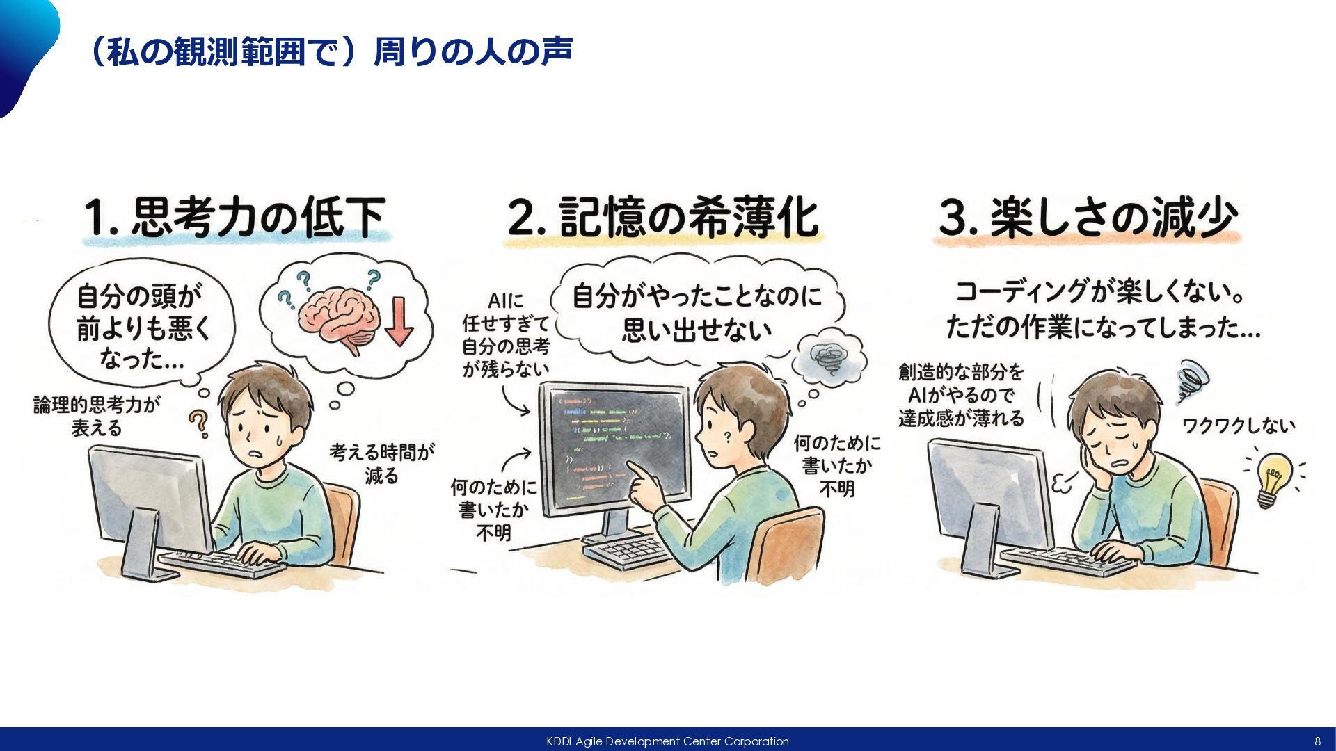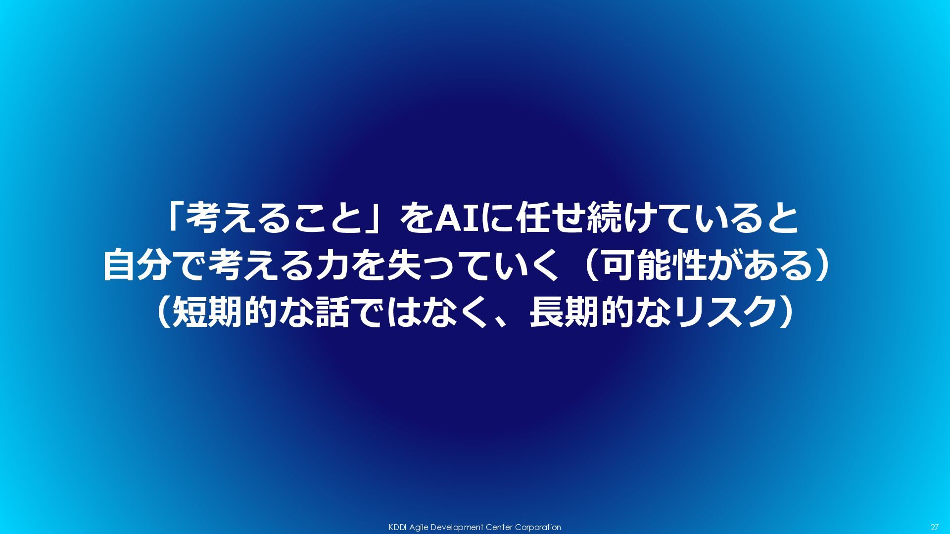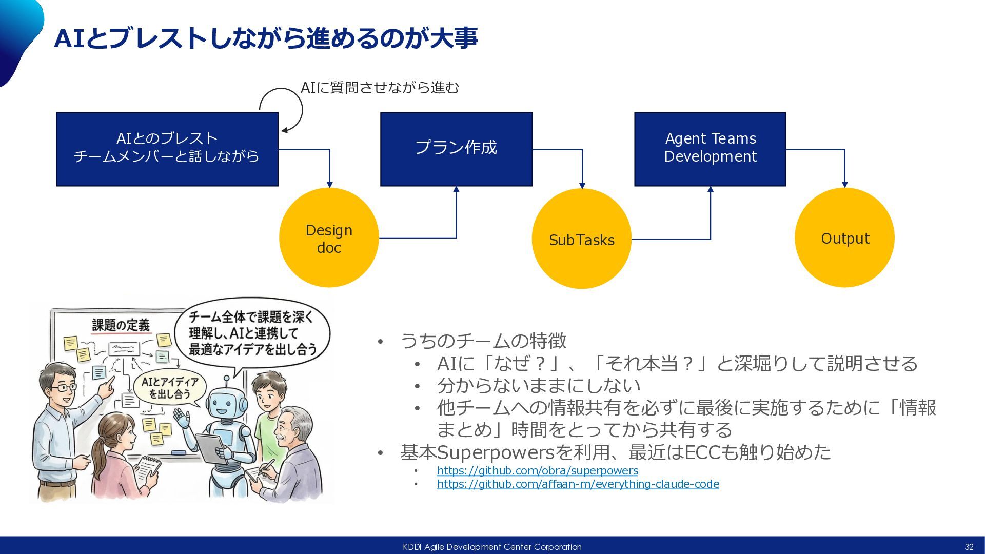 doc プラン作成 Agent Teams Development SubTasks Output AIに質問させながら進む • うちのチームの特徴 • AIに「なぜ?」、「それ本当?」と深堀りして説明させる • 分からないままにしない • 他チームへの情報共有を必ずに最後に実施するために「情報 まとめ」時間をとってから共有する • 基本Superpowersを利用、最近はECCも触り始めた • https://github.com/obra/superpowers • https://github.com/affaan-m/everything-claude-code