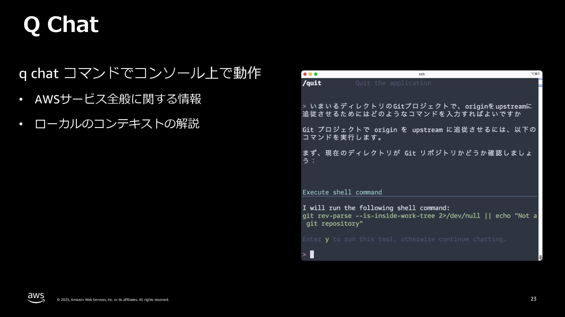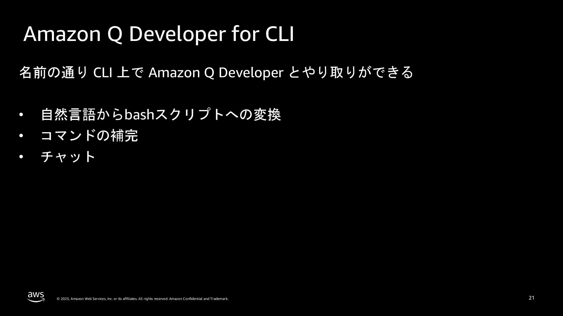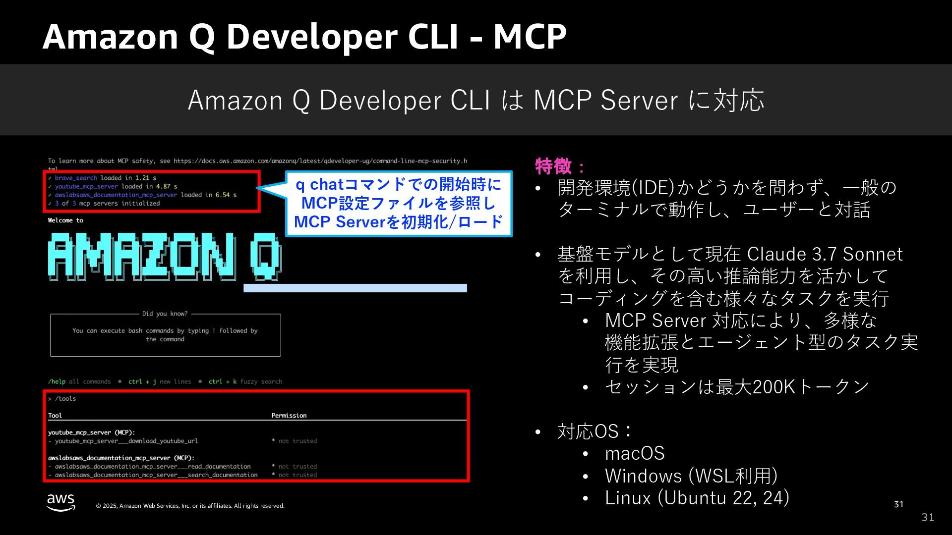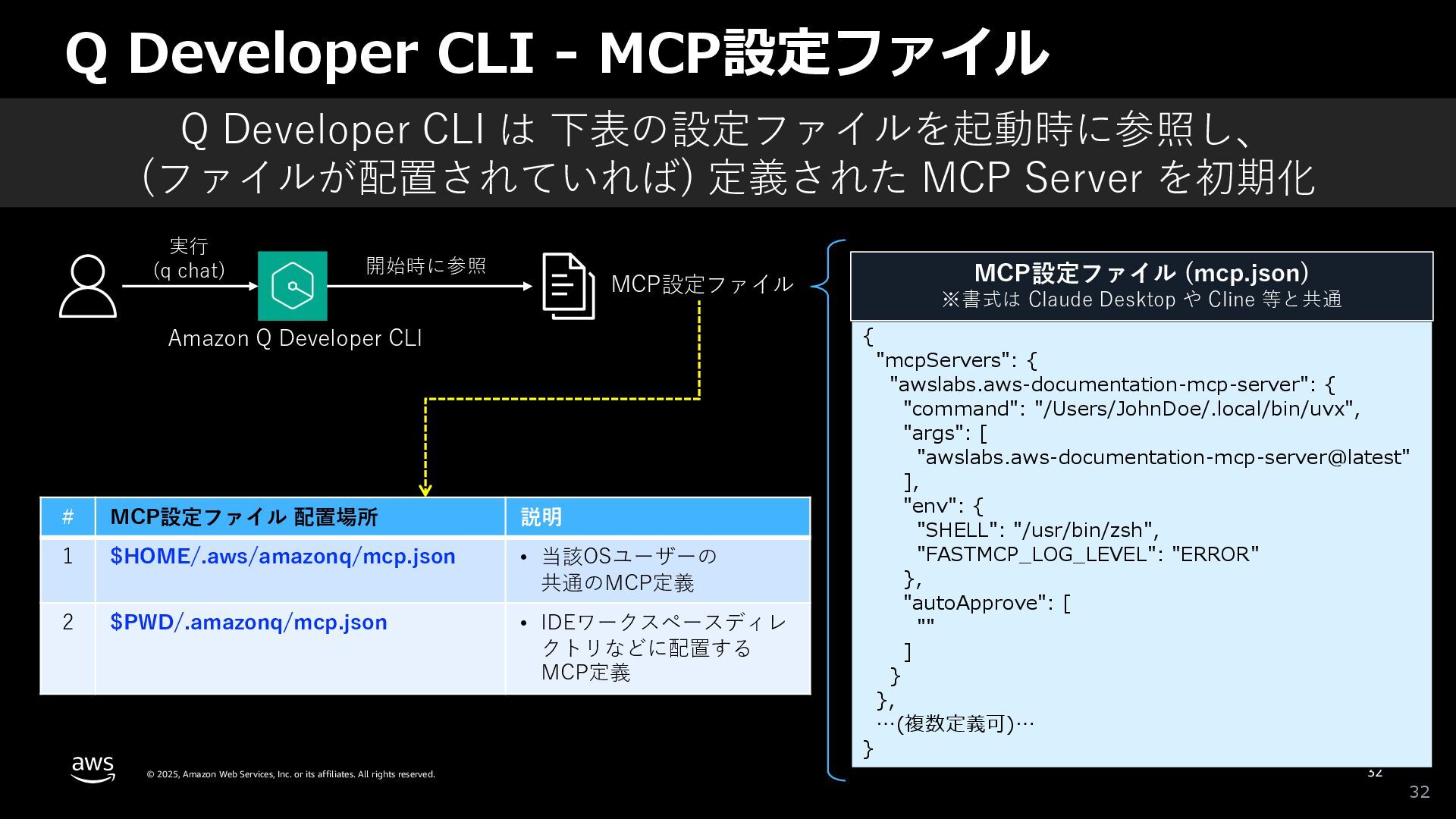 rights reserved. 32 32 { "mcpServers": { "awslabs.aws-documentation-mcp-server": { "command": "/Users/JohnDoe/.local/bin/uvx", "args": [ "awslabs.aws-documentation-mcp-server@latest" ], "env": { "SHELL": "/usr/bin/zsh", "FASTMCP_LOG_LEVEL": "ERROR" }, "autoApprove": [ "" ] } }, …(複数定義可)… } Q Developer CLI - MCP設定ファイル Q Developer CLI は 下表の設定ファイルを起動時に参照し、 (ファイルが配置されていれば) 定義された MCP Server を初期化 # MCP設定ファイル 配置場所 説明 1 $HOME/.aws/amazonq/mcp.json • 当該OSユーザーの 共通のMCP定義 2 $PWD/.amazonq/mcp.json • IDEワークスペースディレ クトリなどに配置する MCP定義 Amazon Q Developer CLI MCP設定ファイル (mcp.json) ※書式は Claude Desktop や Cline 等と共通 MCP設定ファイル 開始時に参照 実⾏ (q chat)