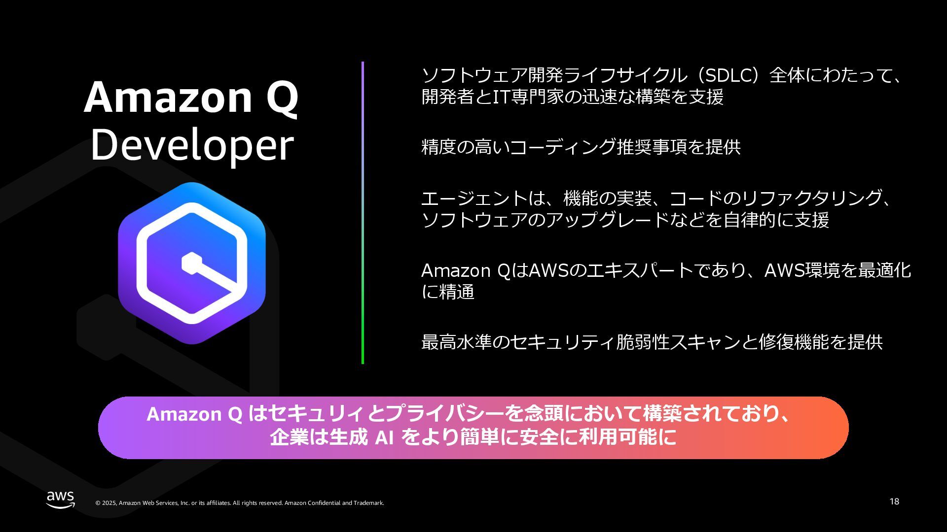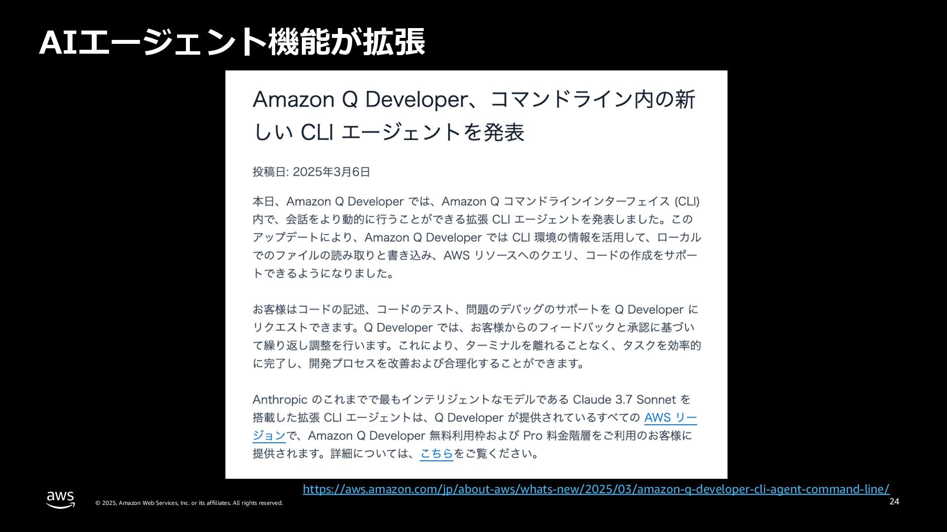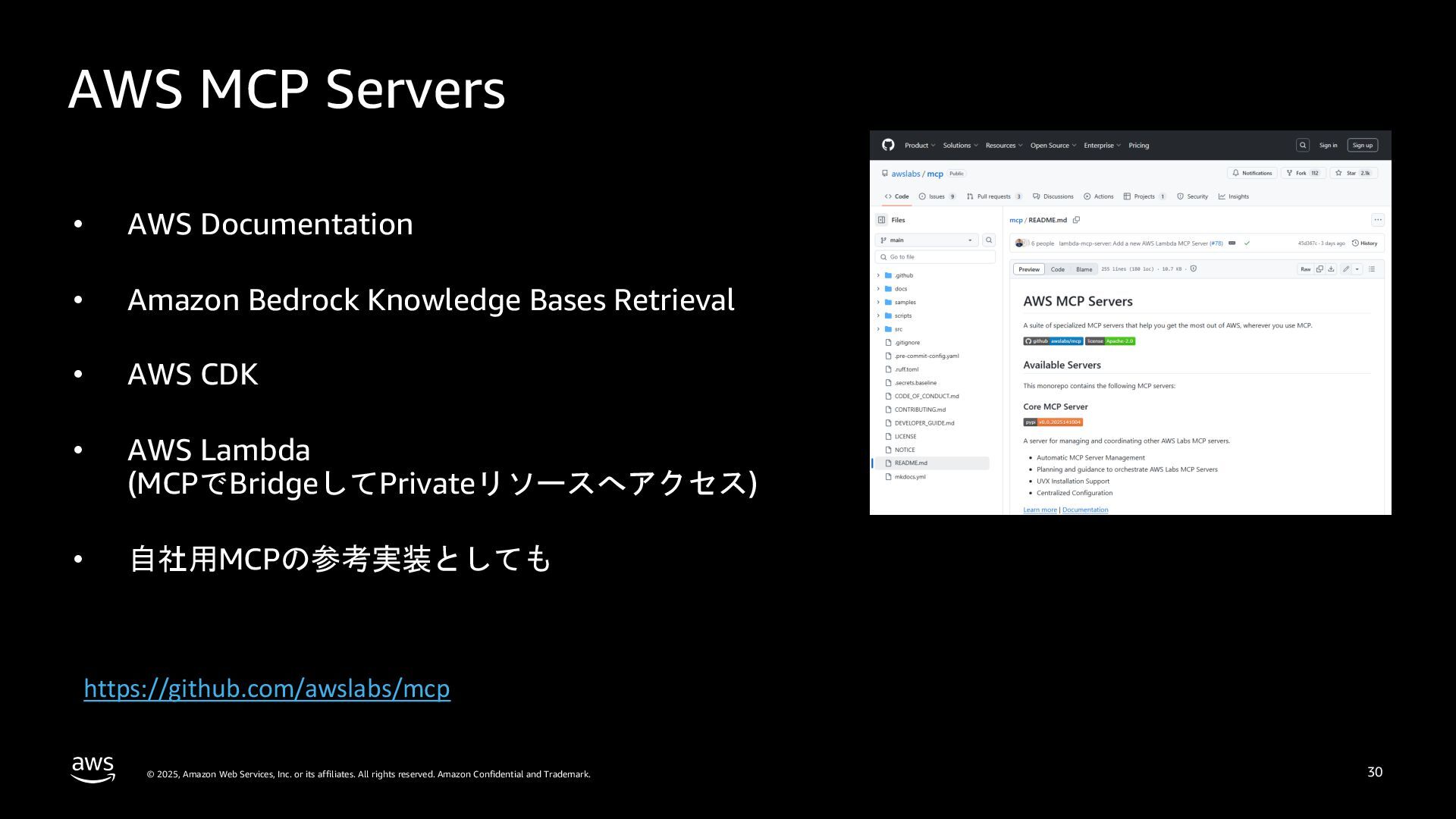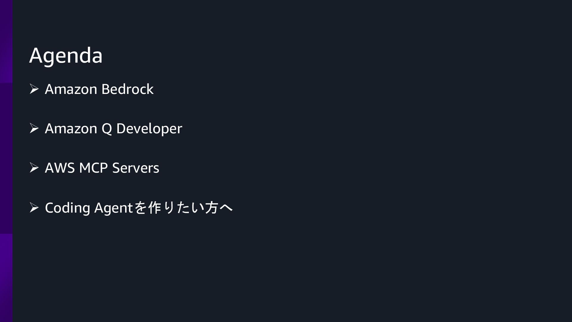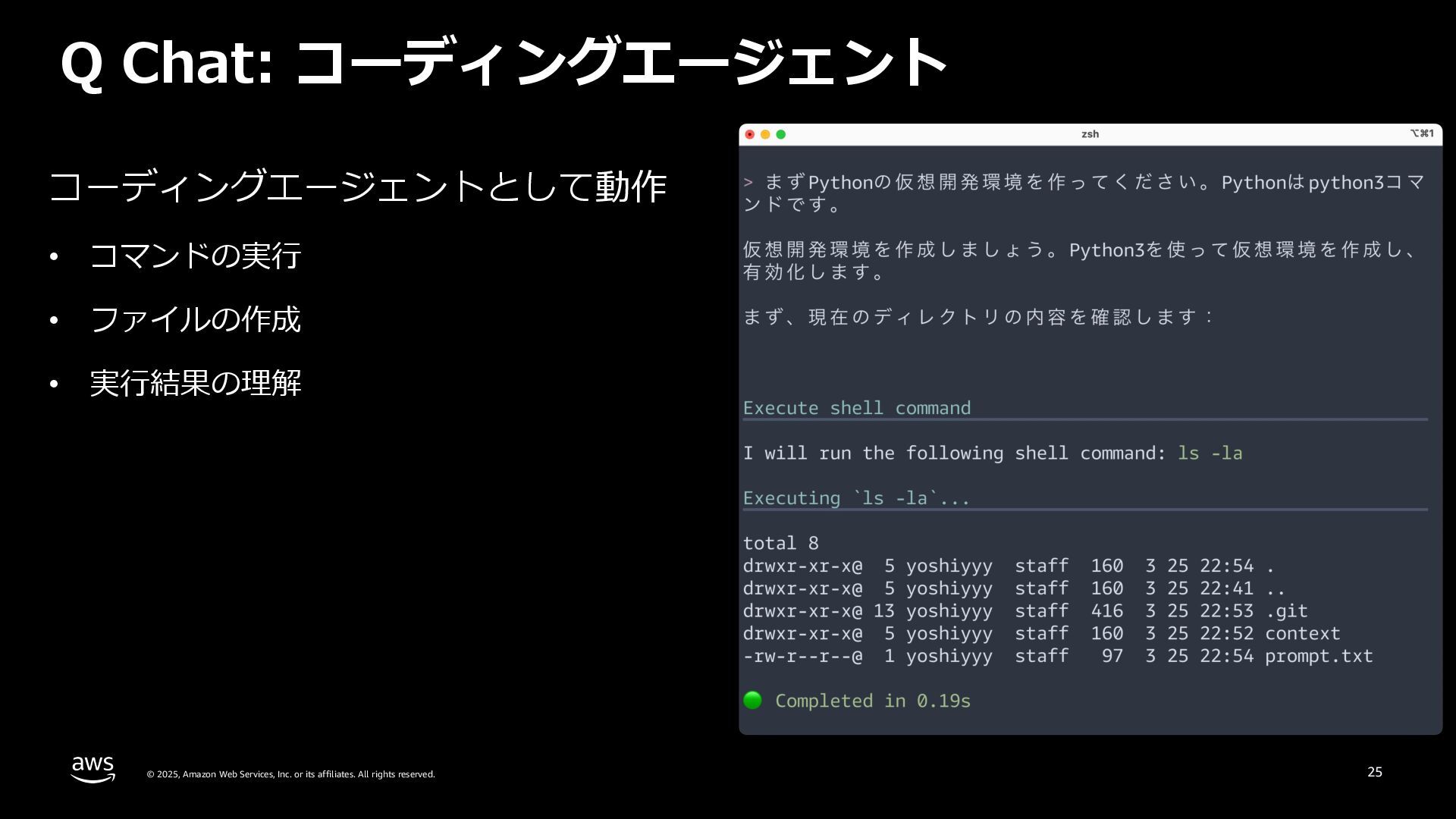 rights reserved. 32 32 { "mcpServers": { "awslabs.aws-documentation-mcp-server": { "command": "/Users/JohnDoe/.local/bin/uvx", "args": [ "awslabs.aws-documentation-mcp-server@latest" ], "env": { "SHELL": "/usr/bin/zsh", "FASTMCP_LOG_LEVEL": "ERROR" }, "autoApprove": [ "" ] } }, …(複数定義可)… } Q Developer CLI - MCP設定ファイル Q Developer CLI は 下表の設定ファイルを起動時に参照し、 (ファイルが配置されていれば) 定義された MCP Server を初期化 # MCP設定ファイル 配置場所 説明 1 $HOME/.aws/amazonq/mcp.json • 当該OSユーザーの 共通のMCP定義 2 $PWD/.amazonq/mcp.json • IDEワークスペースディレ クトリなどに配置する MCP定義 Amazon Q Developer CLI MCP設定ファイル (mcp.json) ※書式は Claude Desktop や Cline 等と共通 MCP設定ファイル 開始時に参照 実⾏ (q chat)