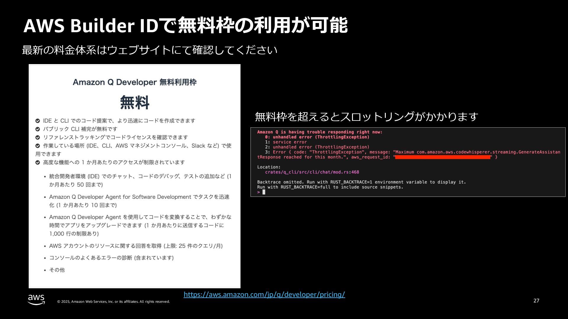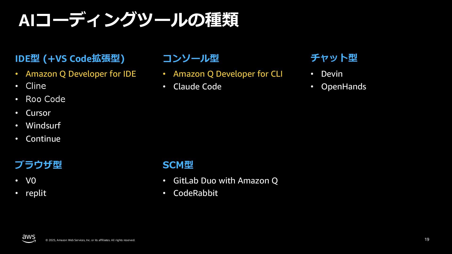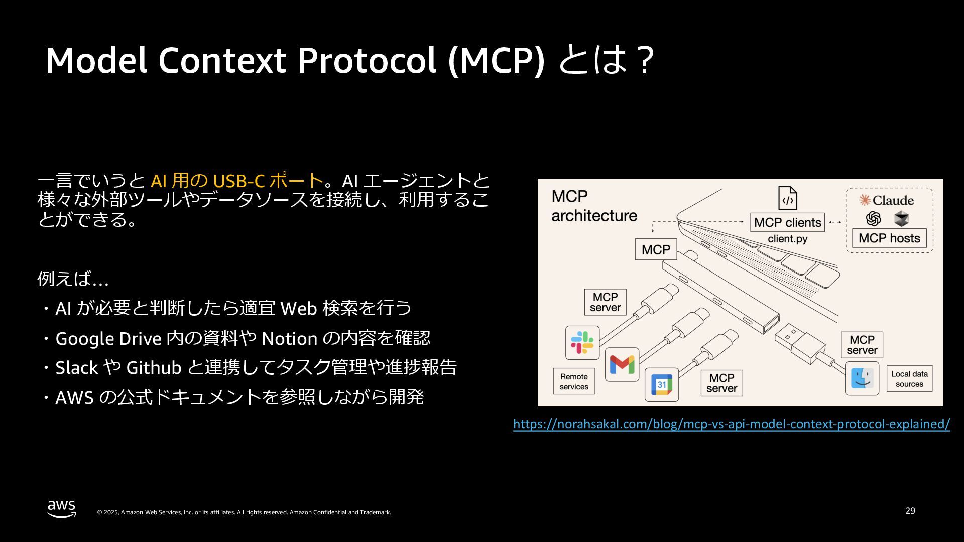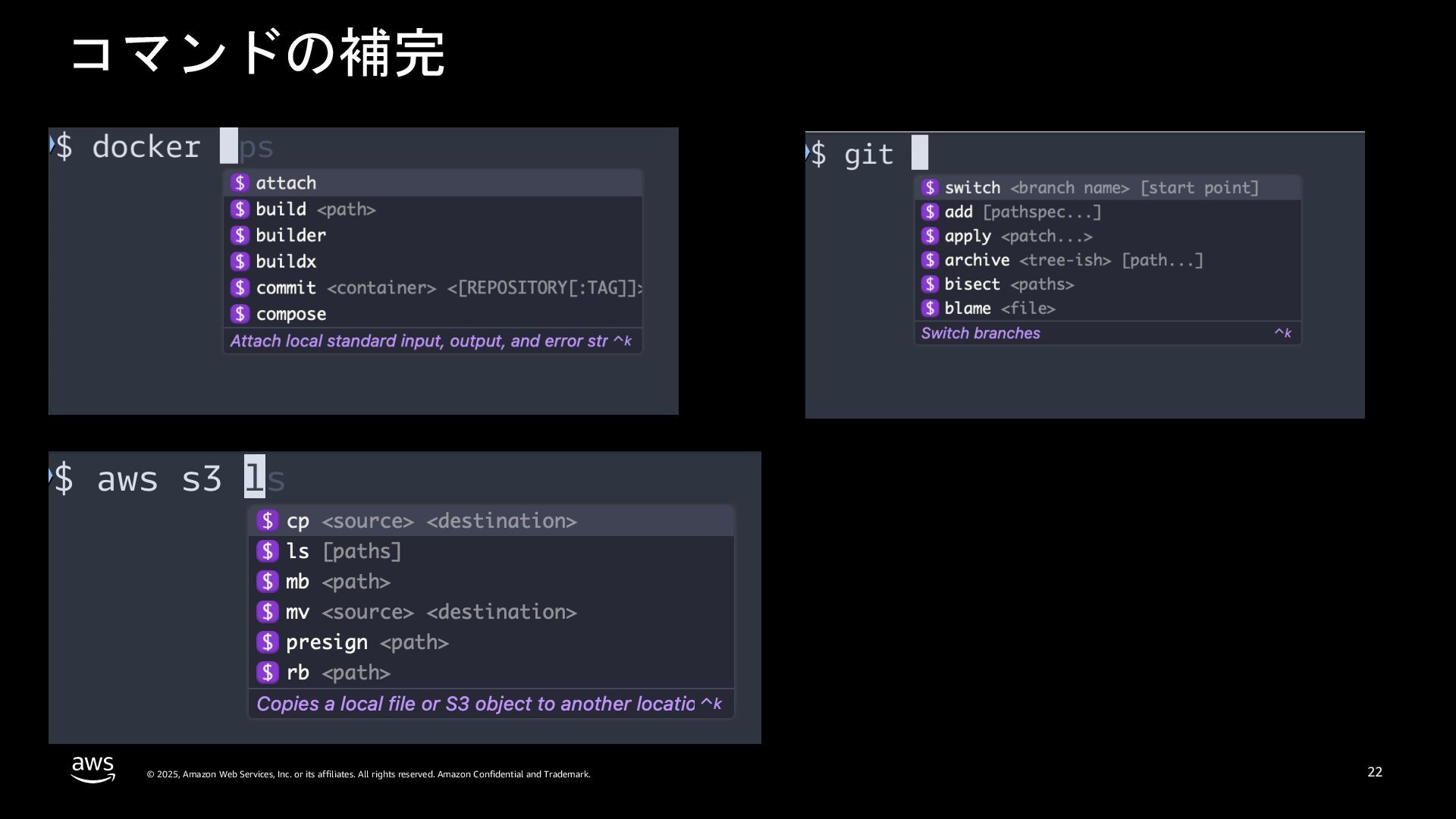 rights reserved. 32 32 { "mcpServers": { "awslabs.aws-documentation-mcp-server": { "command": "/Users/JohnDoe/.local/bin/uvx", "args": [ "awslabs.aws-documentation-mcp-server@latest" ], "env": { "SHELL": "/usr/bin/zsh", "FASTMCP_LOG_LEVEL": "ERROR" }, "autoApprove": [ "" ] } }, …(複数定義可)… } Q Developer CLI - MCP設定ファイル Q Developer CLI は 下表の設定ファイルを起動時に参照し、 (ファイルが配置されていれば) 定義された MCP Server を初期化 # MCP設定ファイル 配置場所 説明 1 $HOME/.aws/amazonq/mcp.json • 当該OSユーザーの 共通のMCP定義 2 $PWD/.amazonq/mcp.json • IDEワークスペースディレ クトリなどに配置する MCP定義 Amazon Q Developer CLI MCP設定ファイル (mcp.json) ※書式は Claude Desktop や Cline 等と共通 MCP設定ファイル 開始時に参照 実⾏ (q chat)