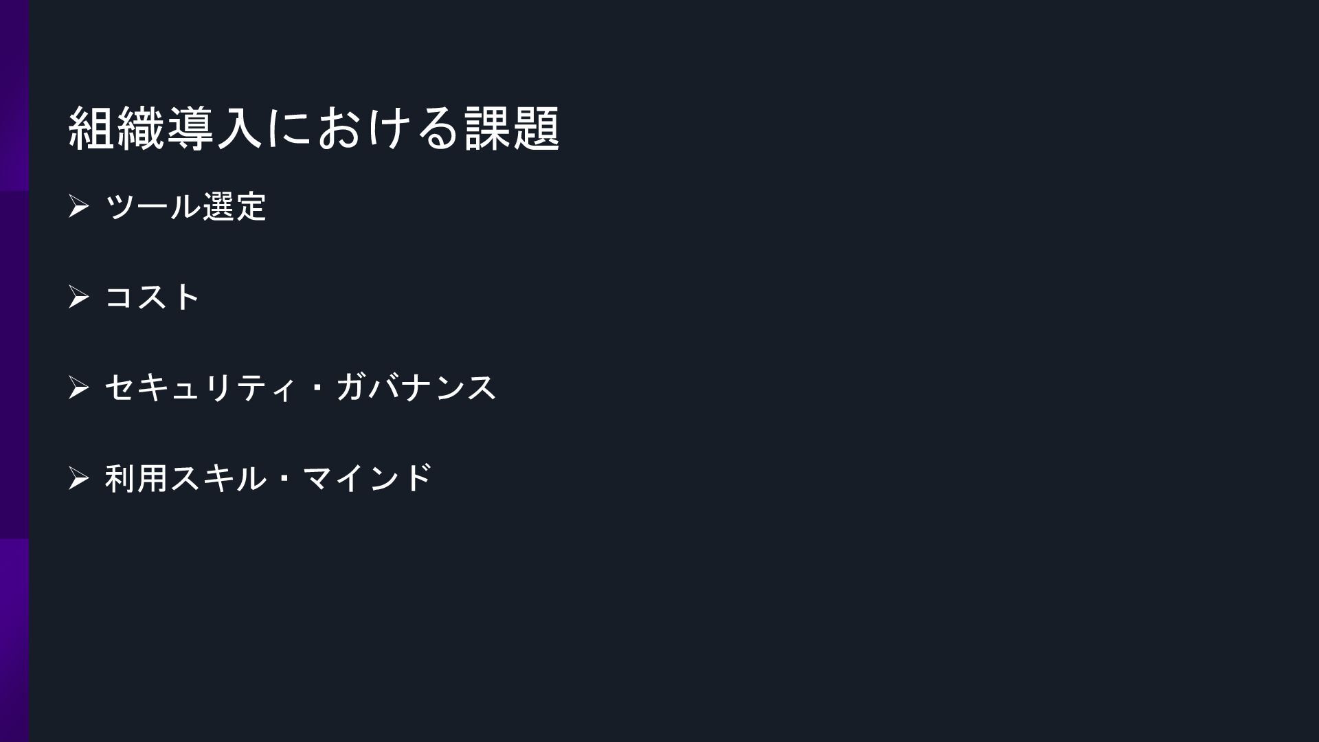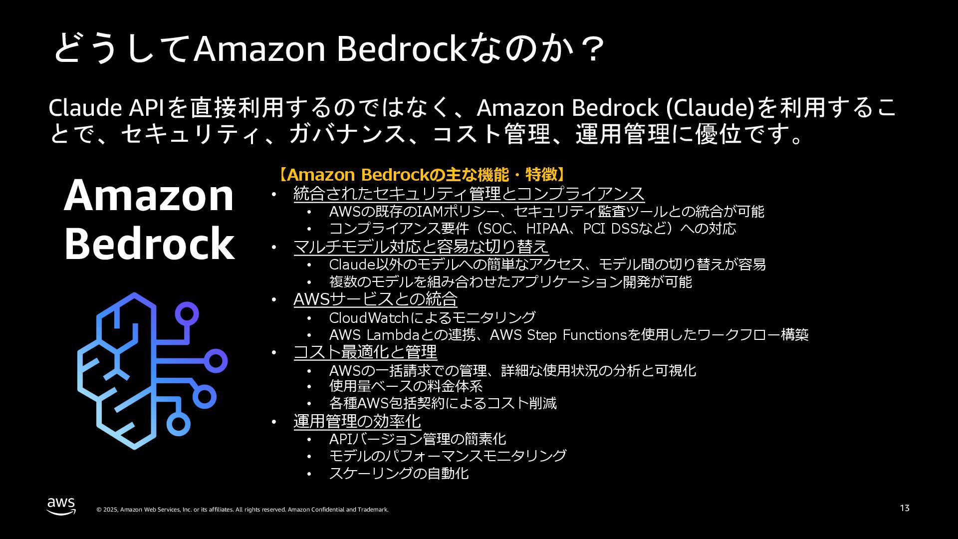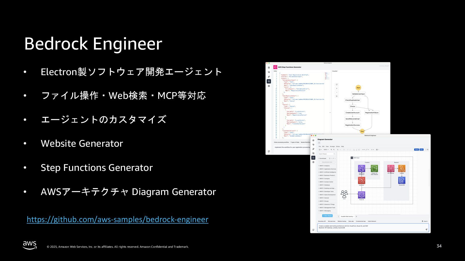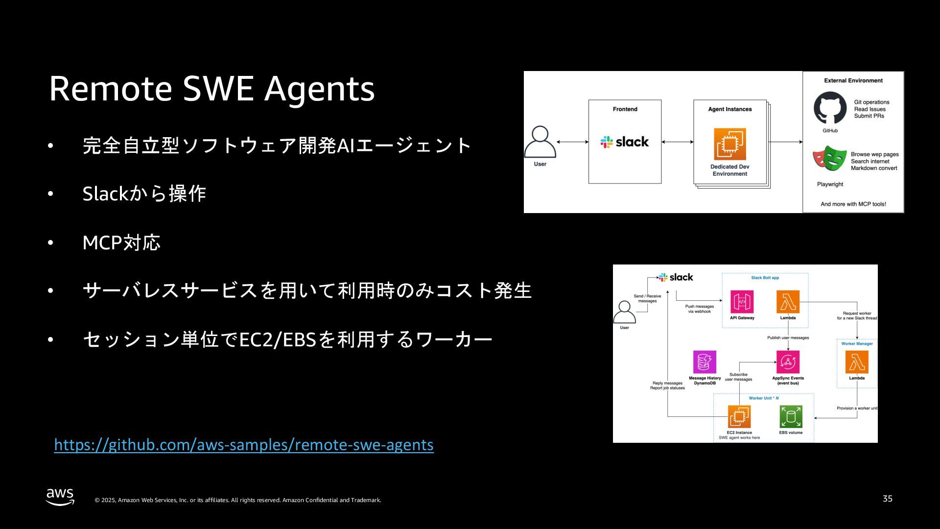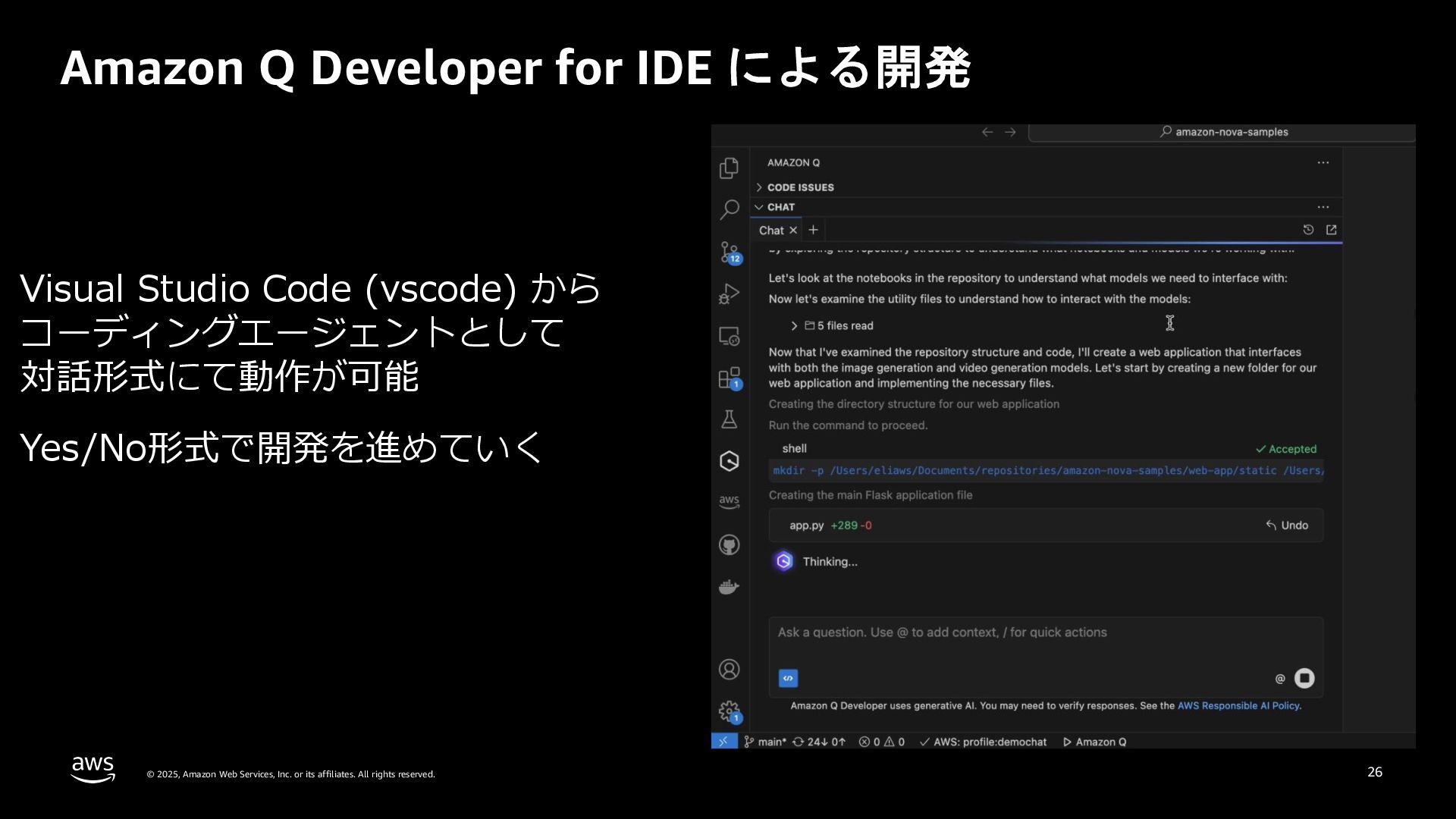 rights reserved. 32 32 { "mcpServers": { "awslabs.aws-documentation-mcp-server": { "command": "/Users/JohnDoe/.local/bin/uvx", "args": [ "awslabs.aws-documentation-mcp-server@latest" ], "env": { "SHELL": "/usr/bin/zsh", "FASTMCP_LOG_LEVEL": "ERROR" }, "autoApprove": [ "" ] } }, …(複数定義可)… } Q Developer CLI - MCP設定ファイル Q Developer CLI は 下表の設定ファイルを起動時に参照し、 (ファイルが配置されていれば) 定義された MCP Server を初期化 # MCP設定ファイル 配置場所 説明 1 $HOME/.aws/amazonq/mcp.json • 当該OSユーザーの 共通のMCP定義 2 $PWD/.amazonq/mcp.json • IDEワークスペースディレ クトリなどに配置する MCP定義 Amazon Q Developer CLI MCP設定ファイル (mcp.json) ※書式は Claude Desktop や Cline 等と共通 MCP設定ファイル 開始時に参照 実⾏ (q chat)