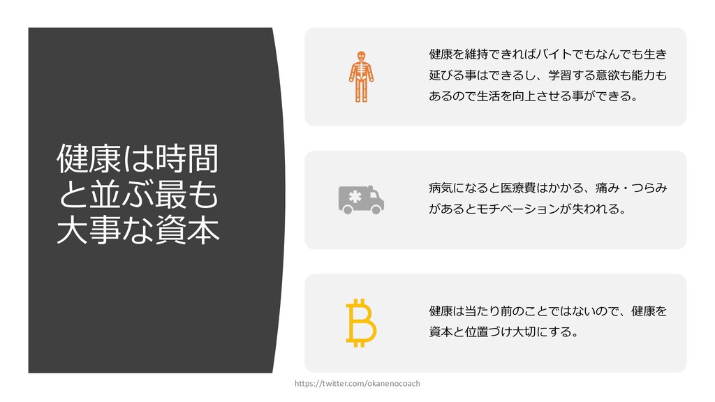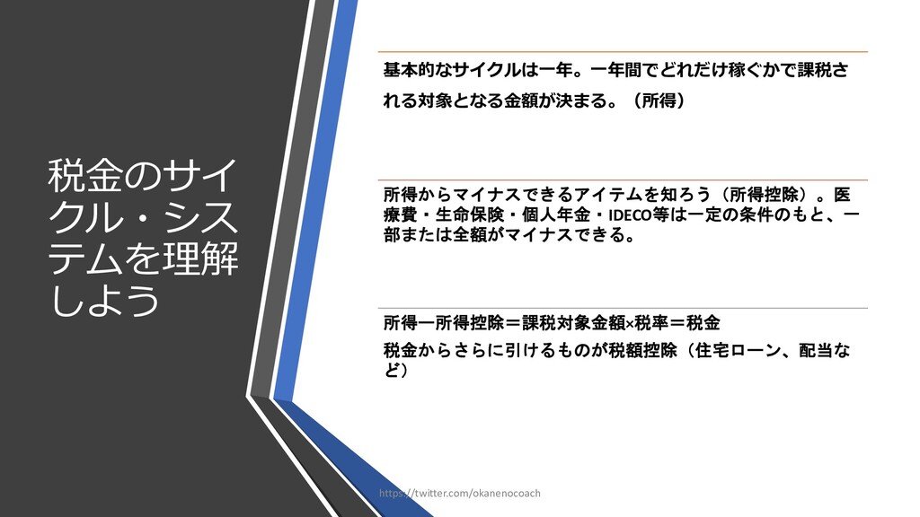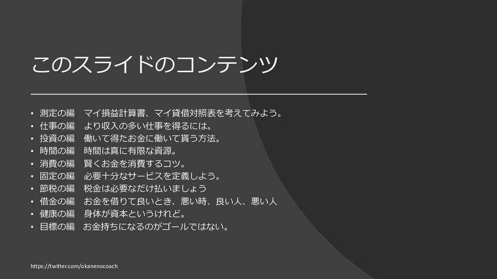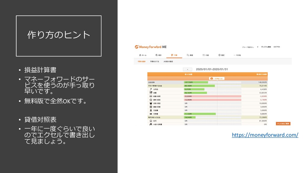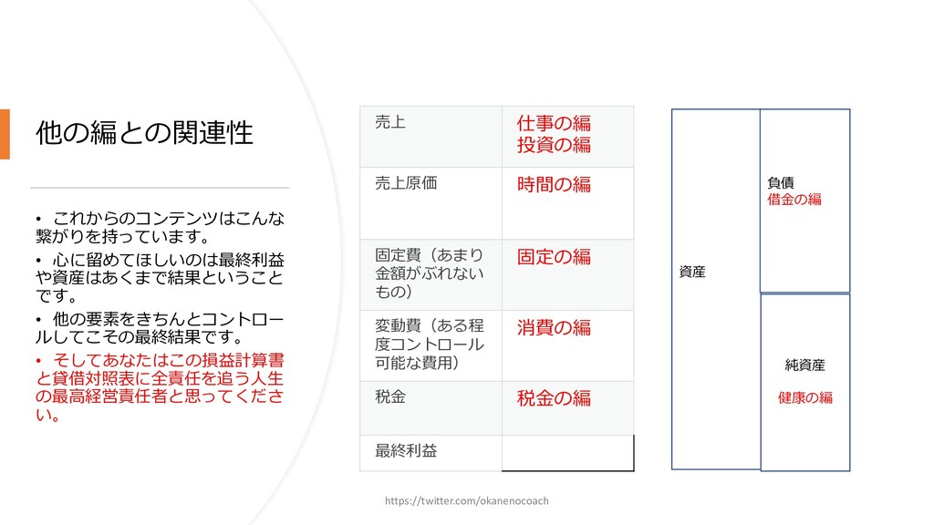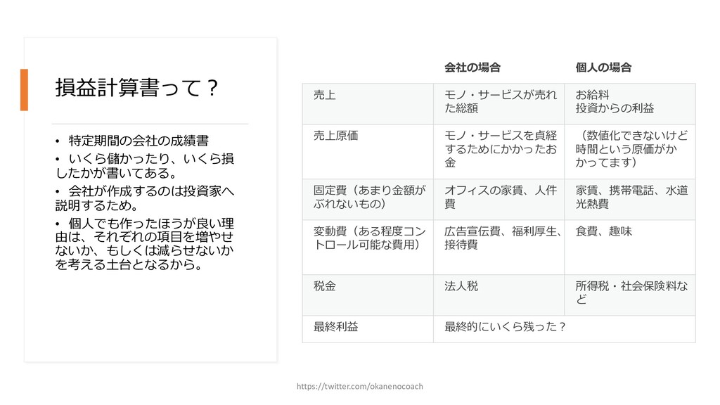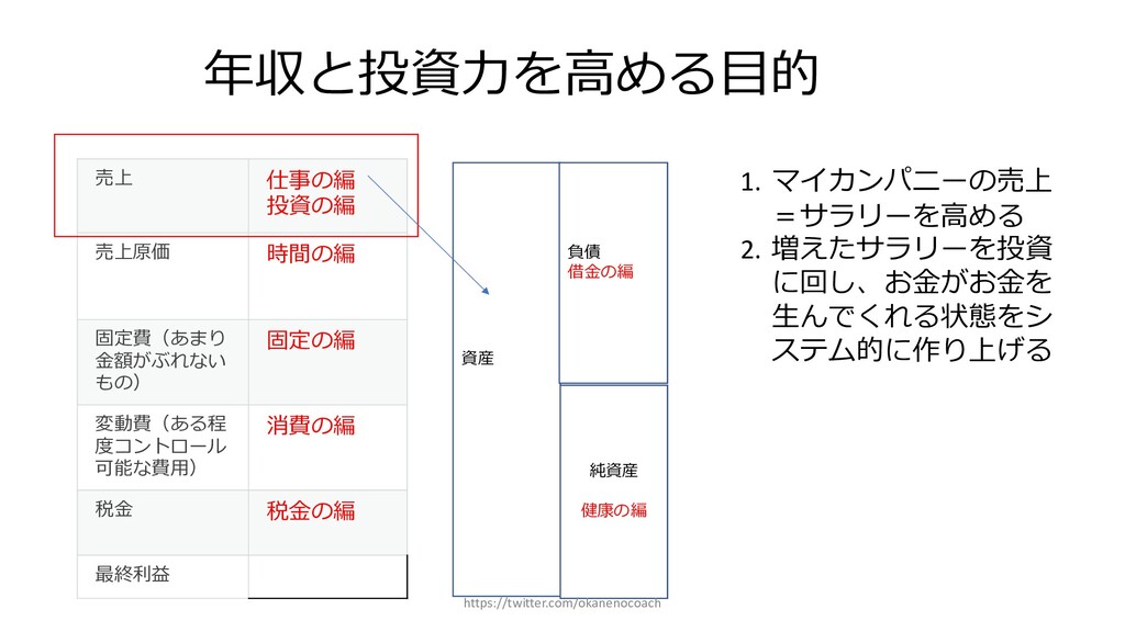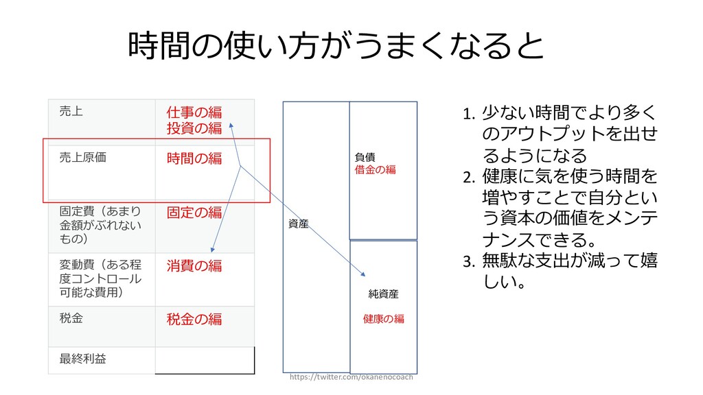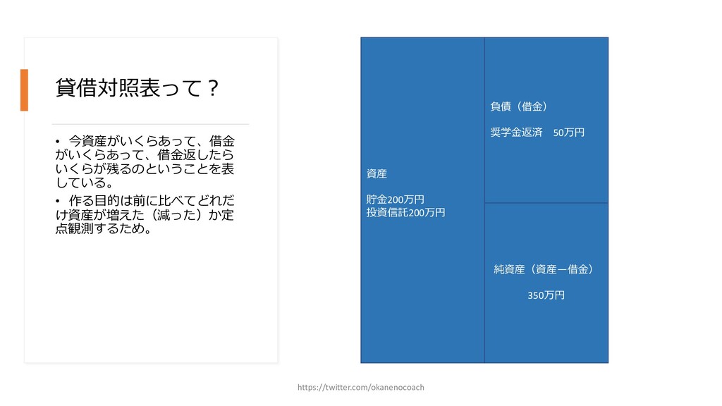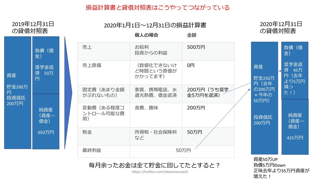 円 純資産 (資産ー 借⾦) 350万円 2019年12⽉31⽇ の貸借対照表 個⼈の場合 ⾦額 売上 お給料 投資からの利益 500万円 売上原価 (数値化できないけ ど時間という原価が かかってます) 0円 固定費(あまり⾦額 がぶれないもの) 家賃、携帯電話、⽔ 道光熱費、借⾦返済 200万円(うち奨学 ⾦5万円を返済) 変動費(ある程度コ ントロール可能な費 ⽤) ⾷費、趣味 200万円 税⾦ 所得税・社会保険料 など 50万円 最終利益 50万円 資産 貯⾦250万 円(去年 の200万円 +今年の 50万円) 投資信託 200万円 負債(借 ⾦) 奨学⾦返 済 45万 円(去年 より5万円 減っ た︕) 純資産 (資産ー 借⾦) 415万円 2020年12⽉31⽇ の貸借対照表 2020年1⽉1⽇〜12⽉31⽇の損益計算書 毎⽉余ったお⾦は全て貯⾦に回してたとすると︖ 資産50万UP 負債5万円Down 正味去年より55万円資産が 増えた︕ 損益計算書と貸借対照表はこうやってつながっている https://twitter.com/okanenocoach