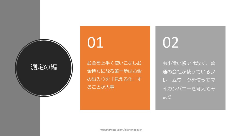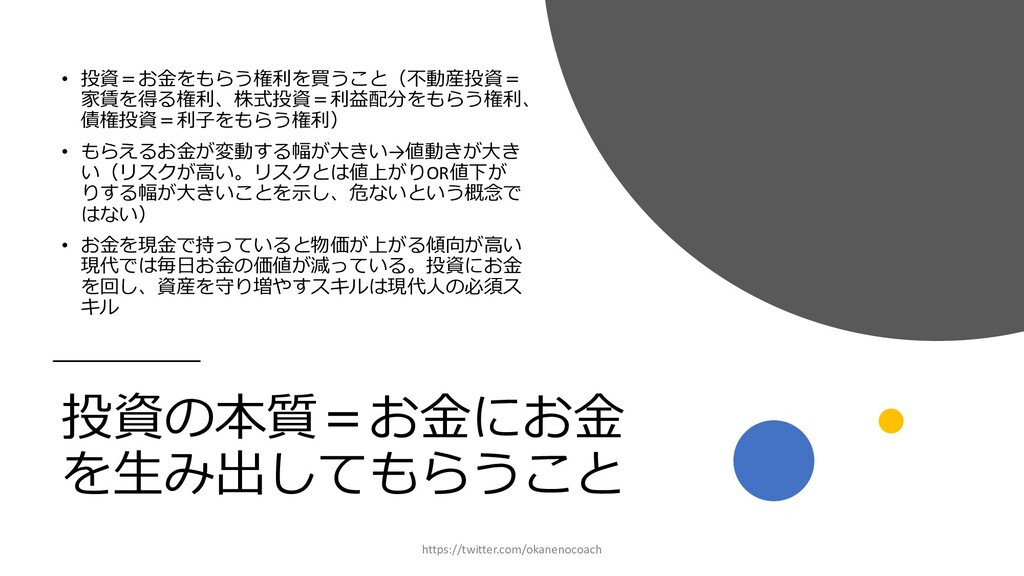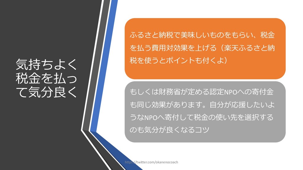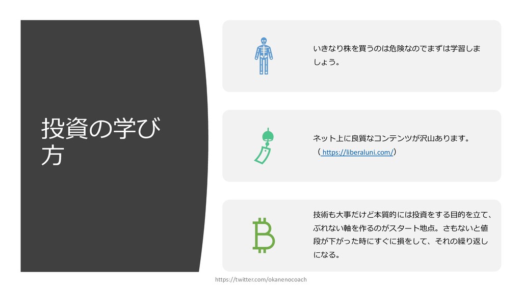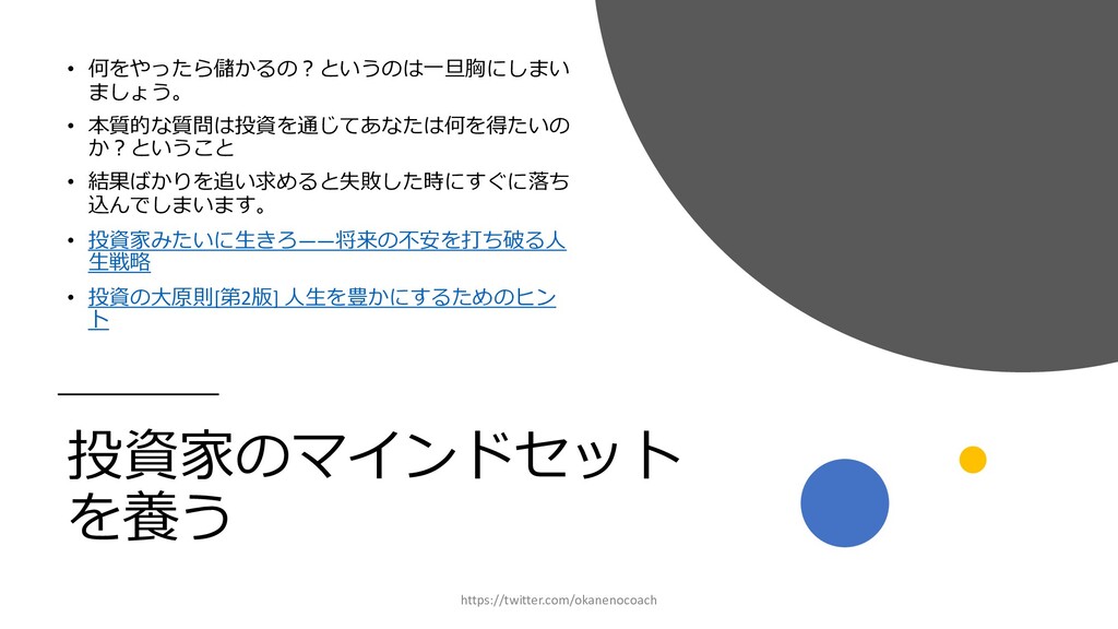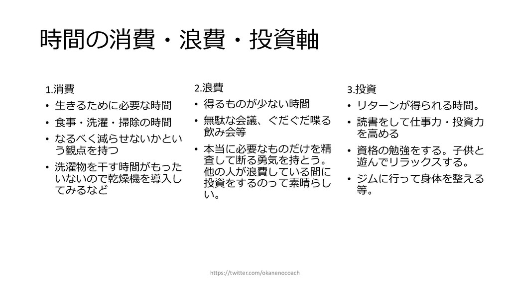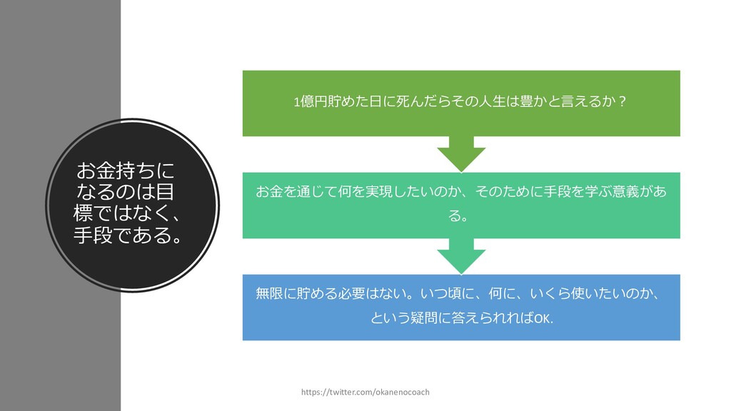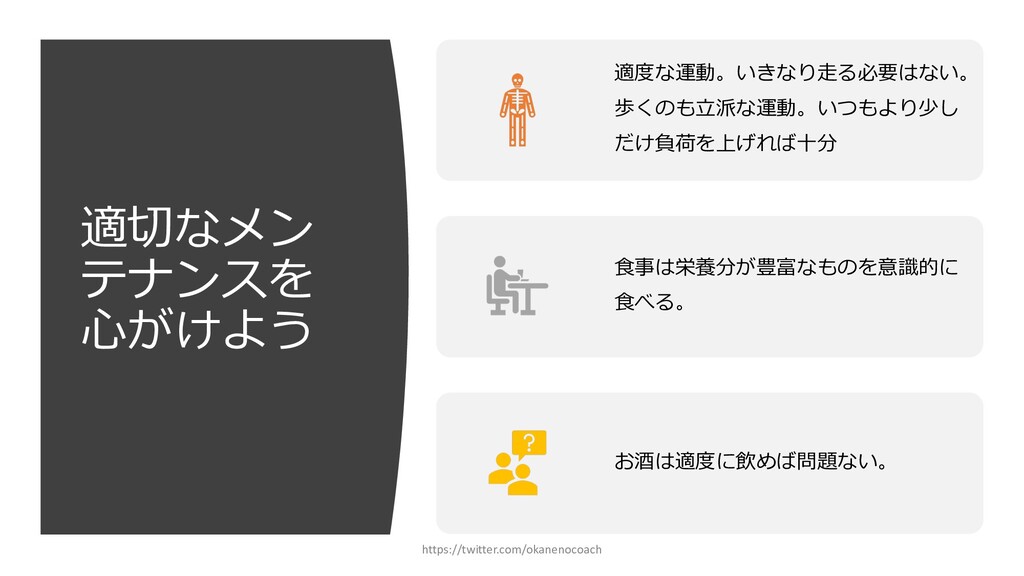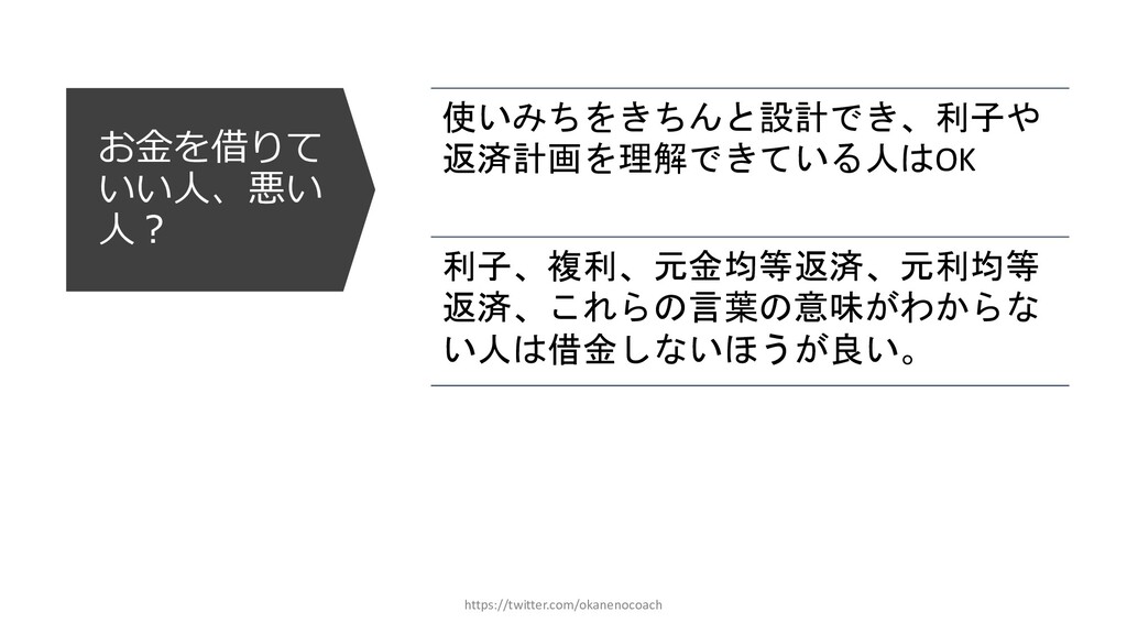円 純資産 (資産ー 借⾦) 350万円 2019年12⽉31⽇ の貸借対照表 個⼈の場合 ⾦額 売上 お給料 投資からの利益 500万円 売上原価 (数値化できないけ ど時間という原価が かかってます) 0円 固定費(あまり⾦額 がぶれないもの) 家賃、携帯電話、⽔ 道光熱費、借⾦返済 200万円(うち奨学 ⾦5万円を返済) 変動費(ある程度コ ントロール可能な費 ⽤) ⾷費、趣味 200万円 税⾦ 所得税・社会保険料 など 50万円 最終利益 50万円 資産 貯⾦250万 円(去年 の200万円 +今年の 50万円) 投資信託 200万円 負債(借 ⾦) 奨学⾦返 済 45万 円(去年 より5万円 減っ た︕) 純資産 (資産ー 借⾦) 415万円 2020年12⽉31⽇ の貸借対照表 2020年1⽉1⽇〜12⽉31⽇の損益計算書 毎⽉余ったお⾦は全て貯⾦に回してたとすると︖ 資産50万UP 負債5万円Down 正味去年より55万円資産が 増えた︕ 損益計算書と貸借対照表はこうやってつながっている https://twitter.com/okanenocoach