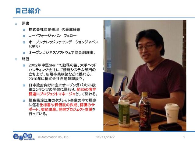 オープンナレッジファウンデーションジャパン (OKFJ) オープンビジネスソフトウェア協会副理事。 略歴 2002年中堅SIerにて勤務の後、大手ヘッド ハンティング会社にて情報システム部門の 立ち上げ、新規事業構築などに携わる。 2010年に株式会社自動処理設立。 日本政府向けに主にオープンガバメント政 策コンテンツの開発に携わり、約80の官庁 調達にプロジェクトマネージャとして関わる。 福島県浪江町のタブレット事業の中で調達 に係る仕様書や評価表の作成、評価のサ ポート、契約法務、開発プロジェクト支援を 行っている。 © Automation Co., Ltd. 1 25/11/2022